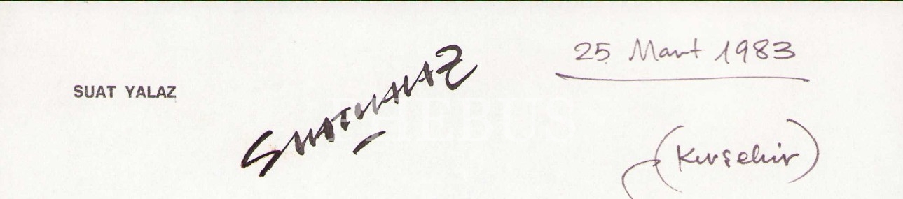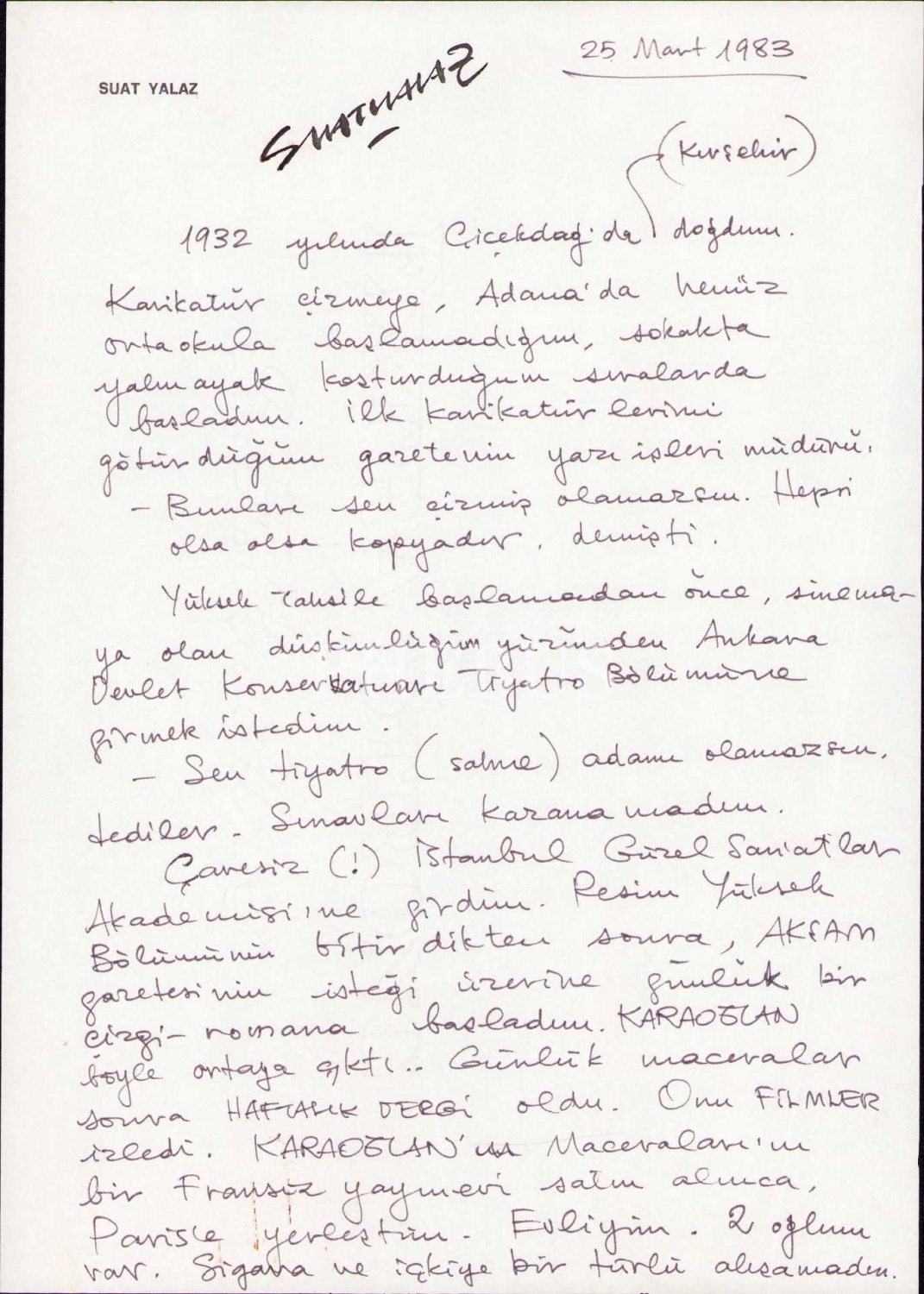 Suat Yalaz tarafından ''Suat Yalaz'' antetli kağıda 25 Mart 1983 tarihinde yazılmış, Yalaz'ın kısaca hayatını ve çalışmalarını özetlediği imzalı mektup, 22x30 cm