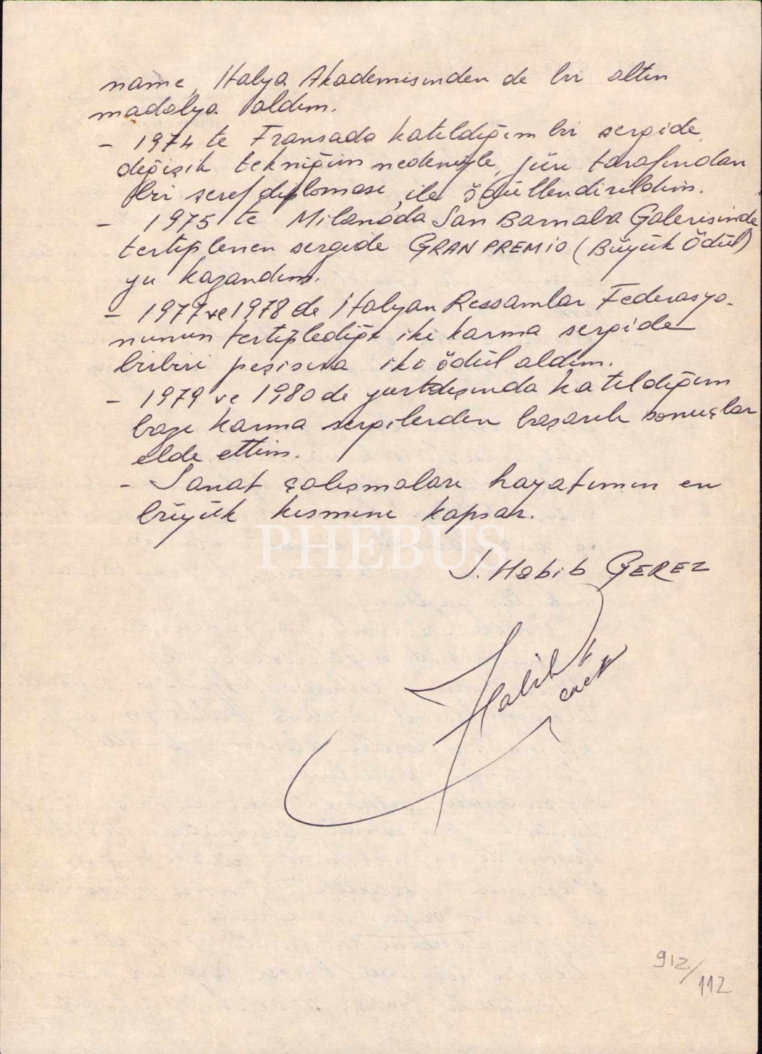 Şair, Yazar ve Ressam J. Habib Gerez'in 1980 yılında J. Habib Gerez antetli kağıda kronolojik olarak hayatını ve çalışmalarını aktardığı mektup, 22x30 cm