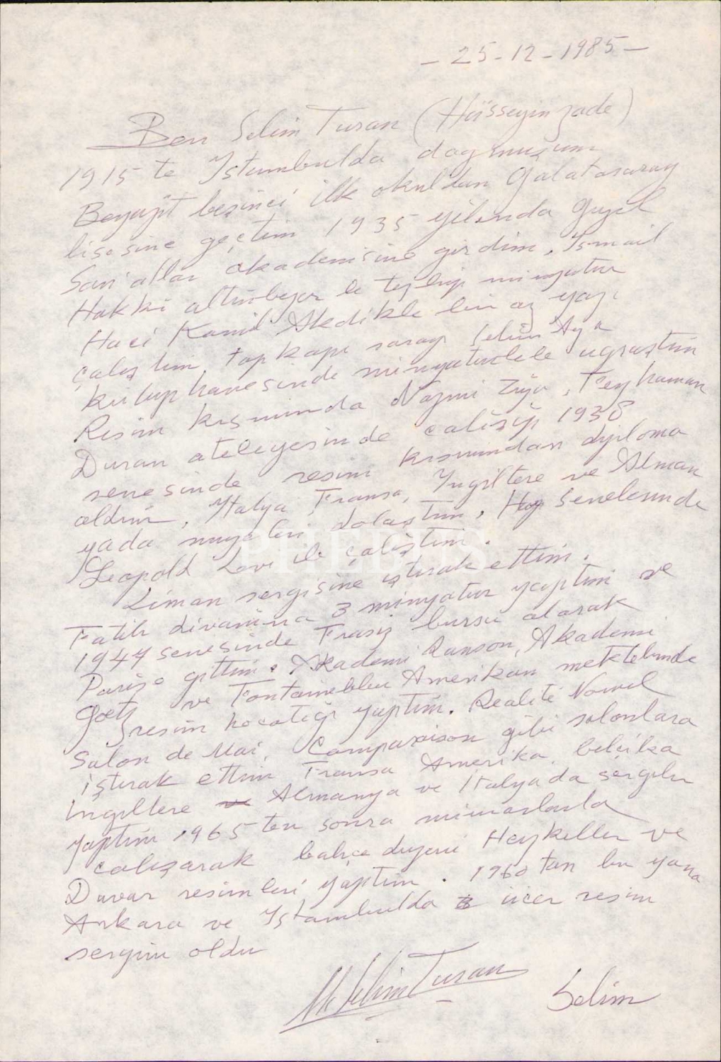 Azerbaycan Kökenli Türk Ressam ve Heykeltıraş Selim Turan'ın 25 Aralık 1985 tarihinde kaleme alınan, hayatını ve çalışmalarını özetlediği mektup, 19x28 cm