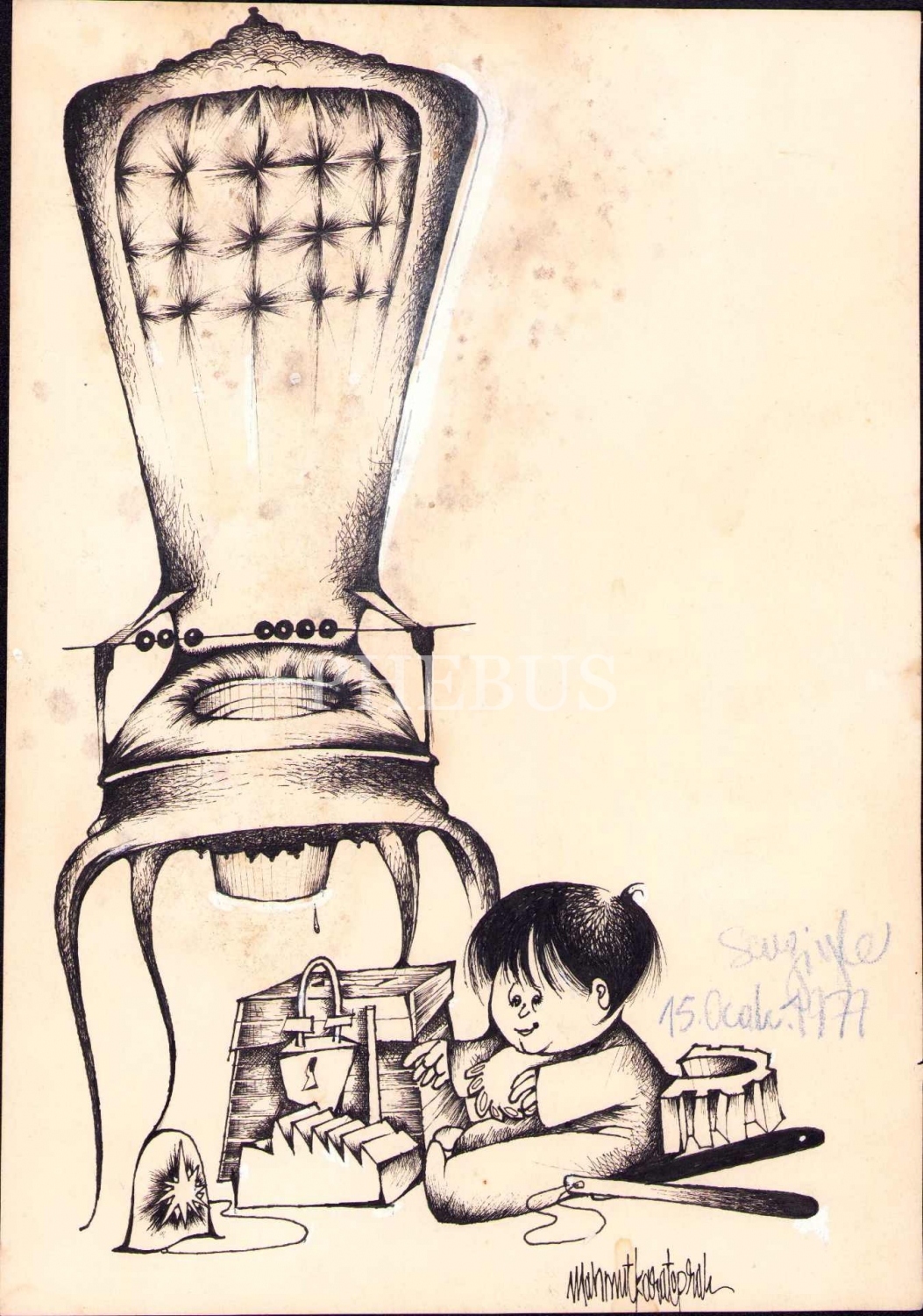 Mahmut Karatoprak'tan Çarşaf Dergisi için çizilmiş 15 Ocak 1977 tarihli ve imzalı çizim, 18x28 cm