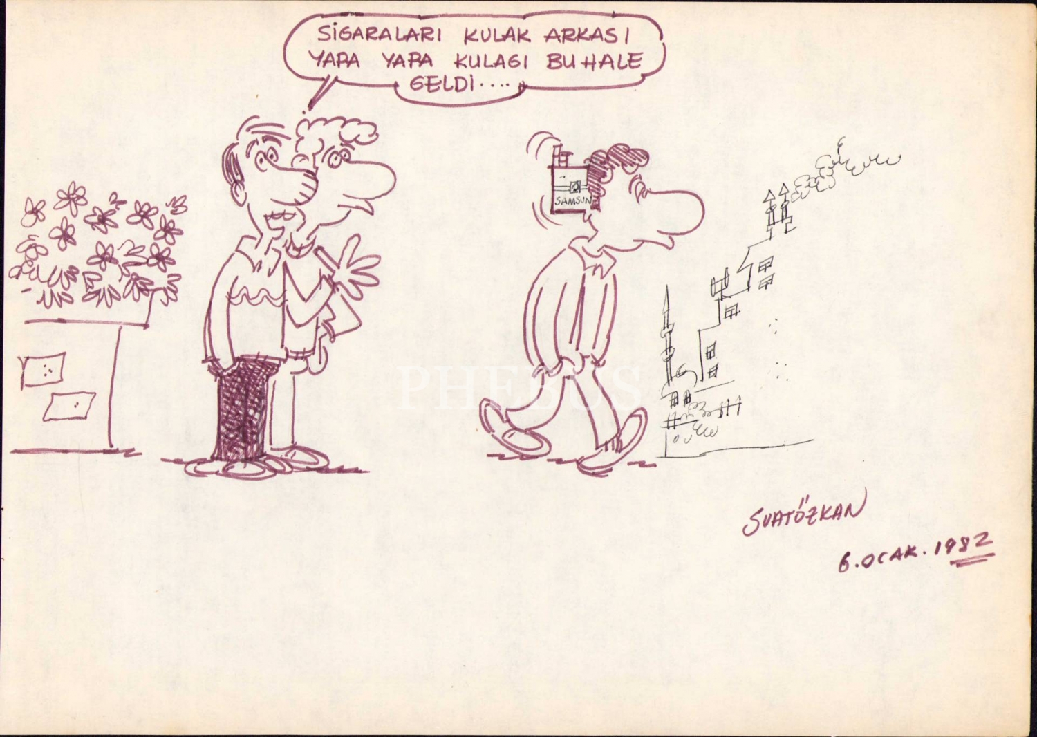 Suat Özkan İmzalı, 6 Ocak 1982 tarihli karikatür çizimi, 34x25 cm