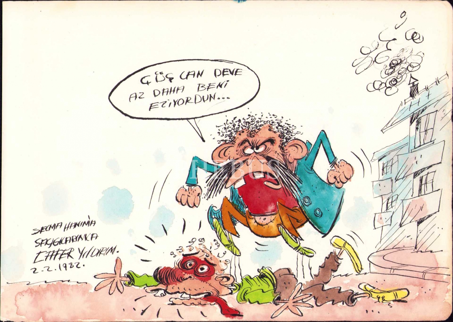 Karikatürist Cafer Yıldırım'dan İthaflı ve İmzalı, 2 Şubat 1982 tarihli çizim, 34x25 cm
