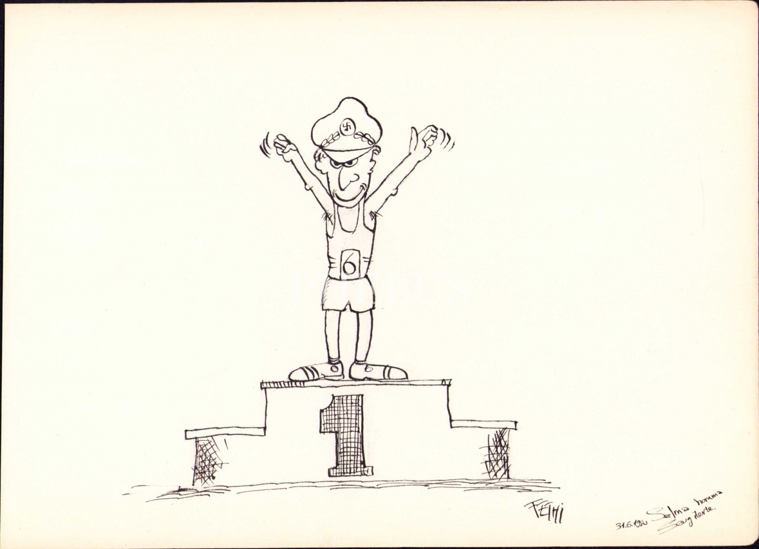 Karikatürist Fethi Develioğlu'ndan İthaflı ve İmzalı, 31 Haziran 1980 tarihli çizim, 34x25 cm