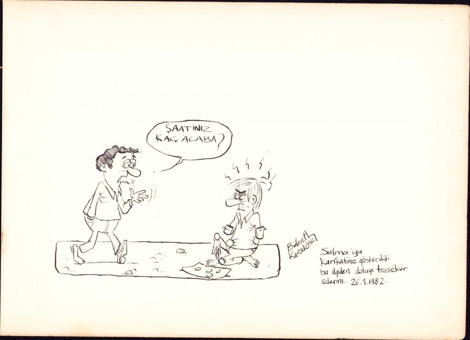 Karikatürist ve Yazar Bülent Karaköse'den İthaflı ve İmzalı çizim, 26 Ocak 1982 tarihli, 34x25 cm