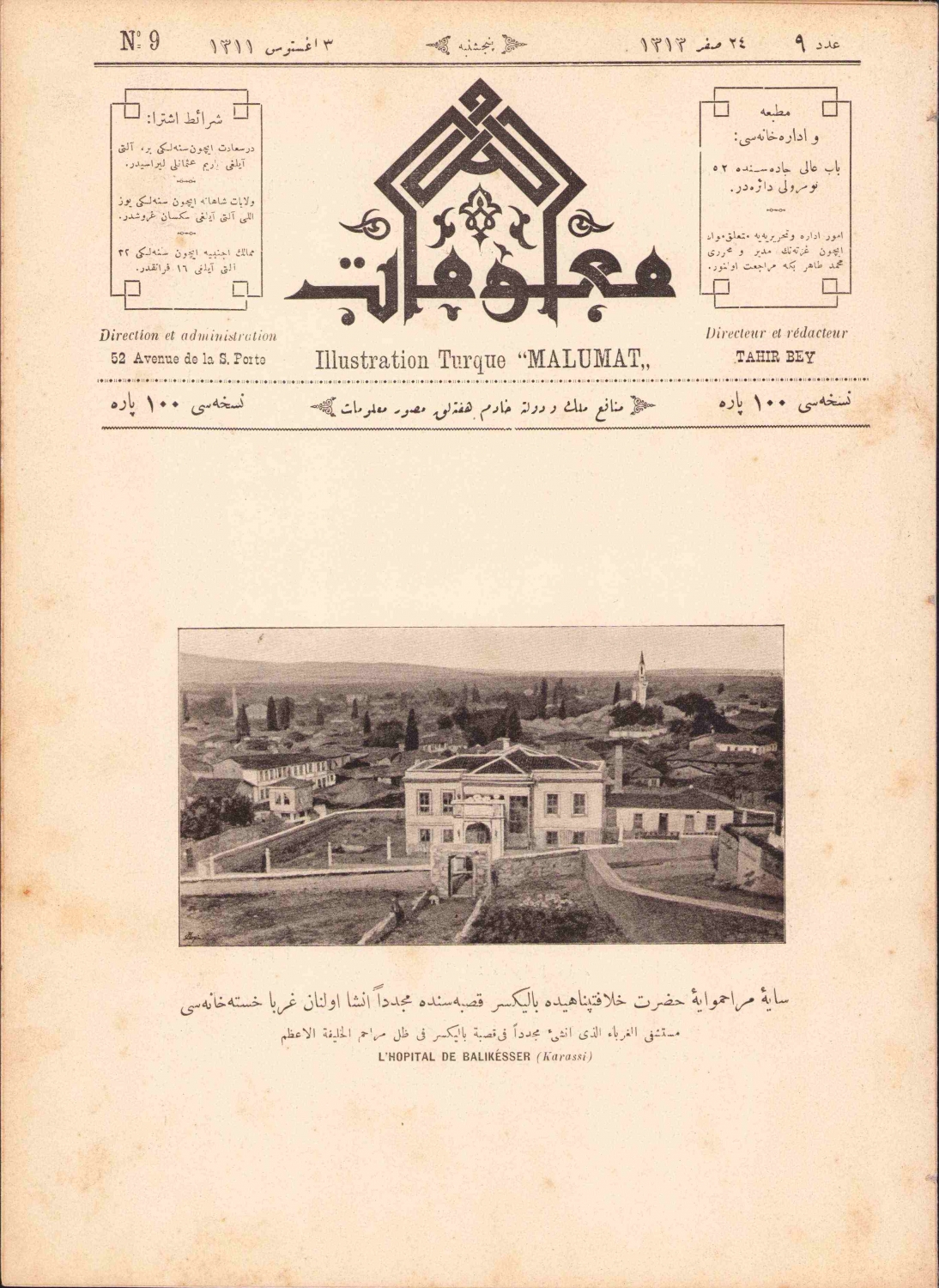 Osmanlı Malumat, Gazete müdürü ve muharriri Tahir Bey, 1313, Balıkesir Hastanesi görselli kapak, arka kapak Fransızca yazılı, 21 sayfa, 23x32cm