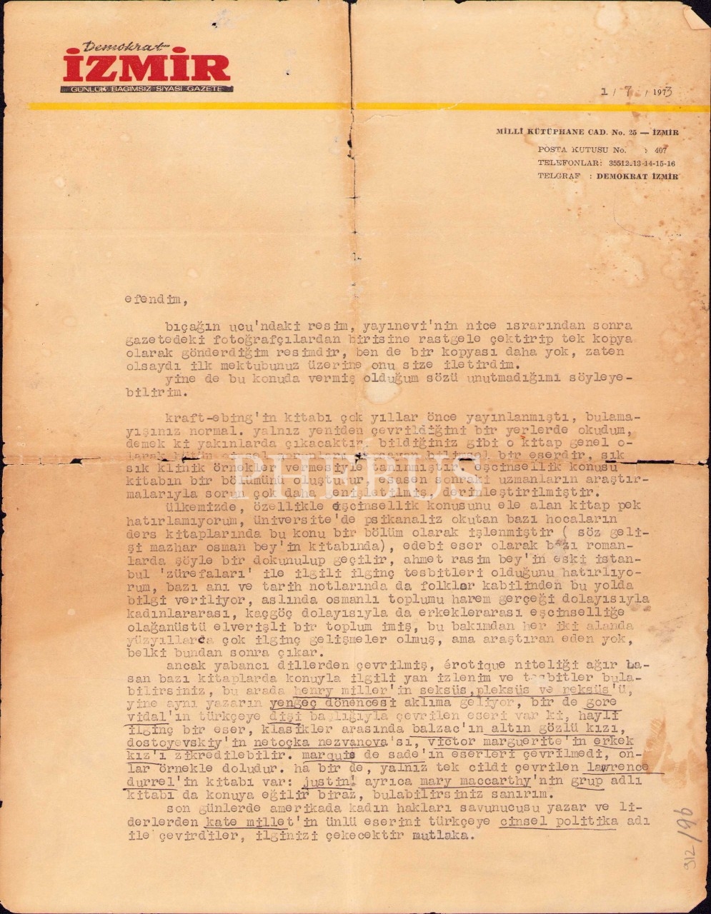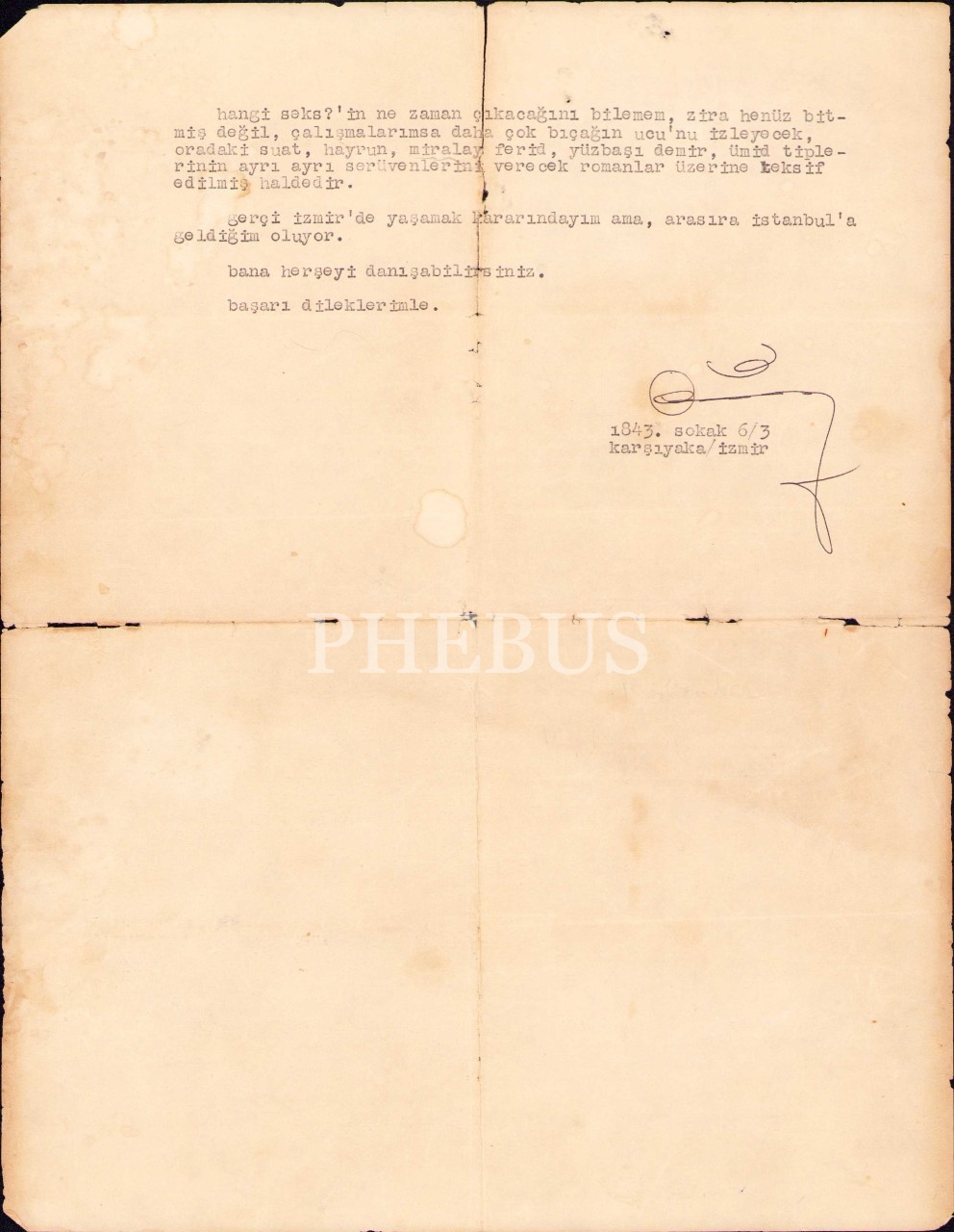 Şair Attila İlhan, "Demokrat İzmir" gazetesinin başyazarlığını ve genel yayın yönetmenliğini yürütmüştür. Yukarıdaki belge, Attila İlhan'ın Demokrat İzmir gazetesinde çalıştığı döneme aittir. Daktiloyla yazılmış mektupta Attila İlhan yayınlanmış ve yayınlanmamış çalışmalarından bahsetmektedir.