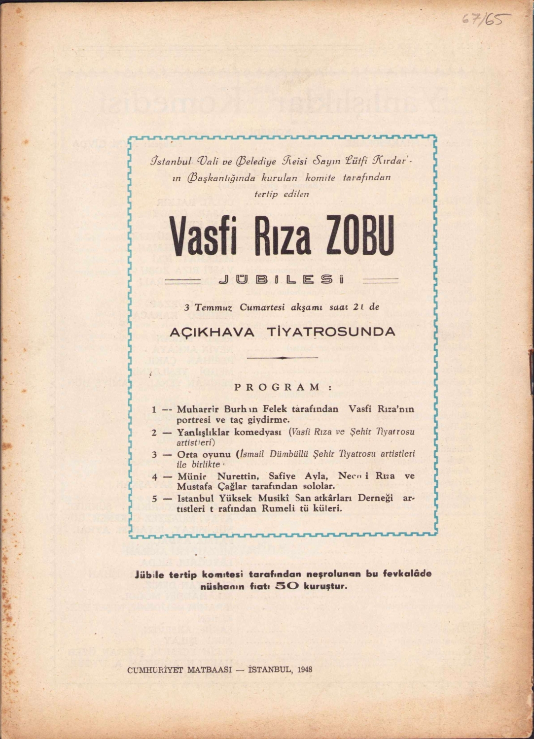 Türk Tiyatrosu dergisi, Vasfi Rıza Zobu kapaklı, yıl 19, sayı 216, 1948 tarihli, 31 sayfa, 20x28cm