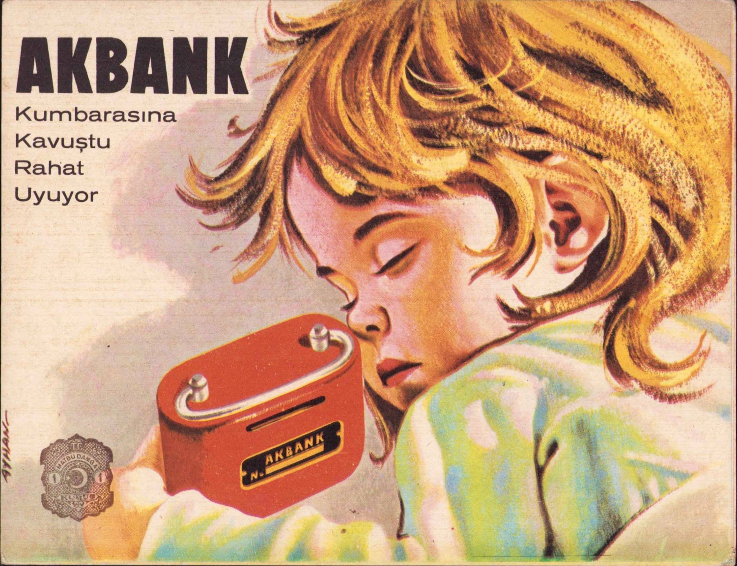 Akbank Kumbarası reklamlı, matbu pullu, küçük karton afiş, 18x14cm