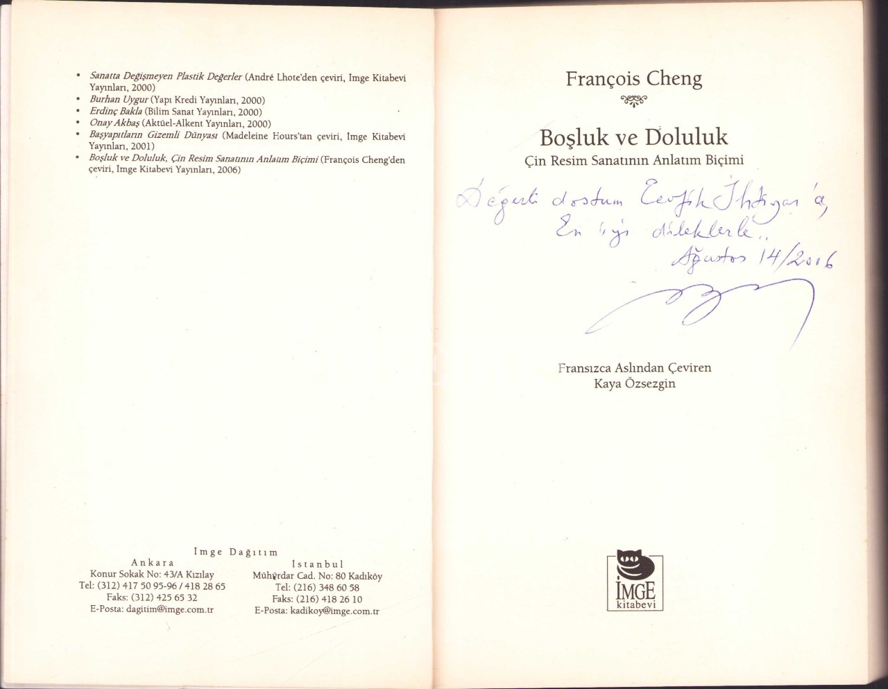 Boşluk ve Doluluk (Çin Resim Sanatının Anlatım Biçimi, François Cheng, Fransızca Aslından Çeviren Kaya Özsezgin'den İthaflı ve İmzalı, İmge Kitabevi Yayınları, 2006