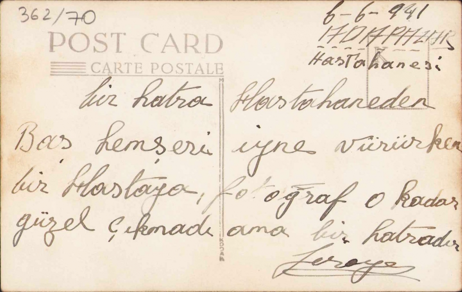 Adapazarı askeri hastanesinde tedavi gören askerler, 1941 tarihli, arkası ithaf yazılı, 14x8,5cm