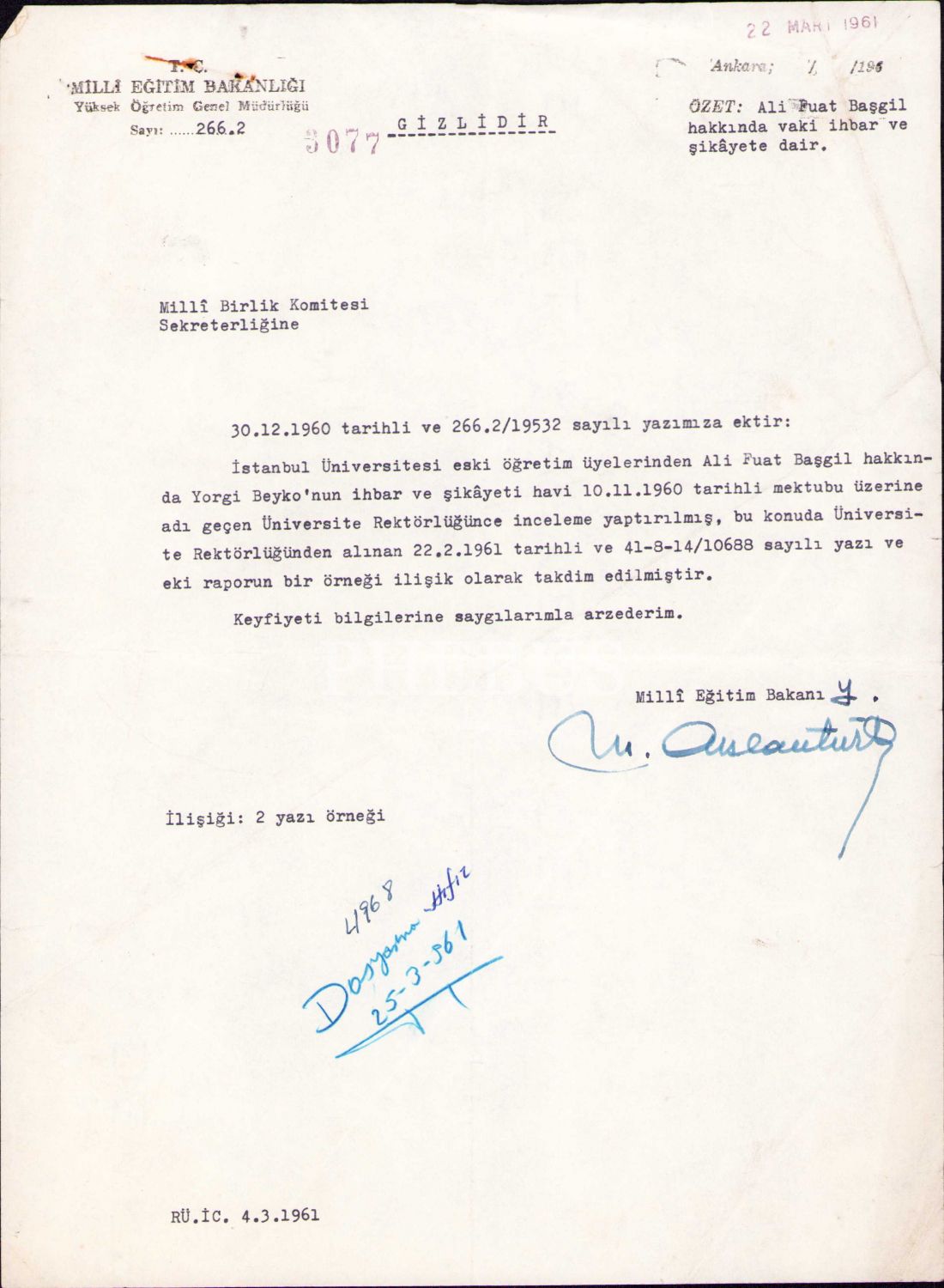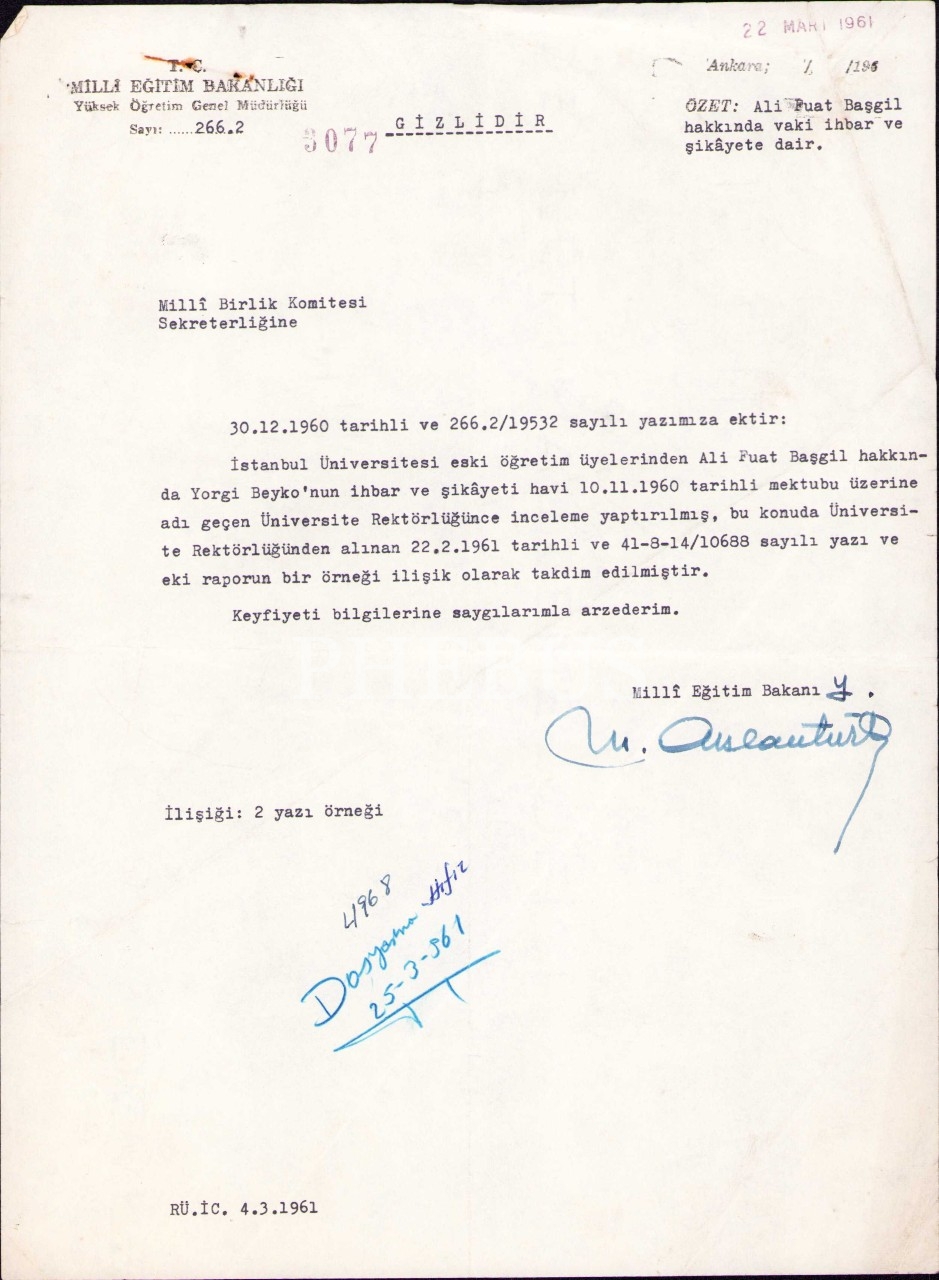 Millî Eğitim Bakanlığı antetli, "Gizlidir" ibaresi yer alan evrak, 1961 tarihli, 21x28 cm