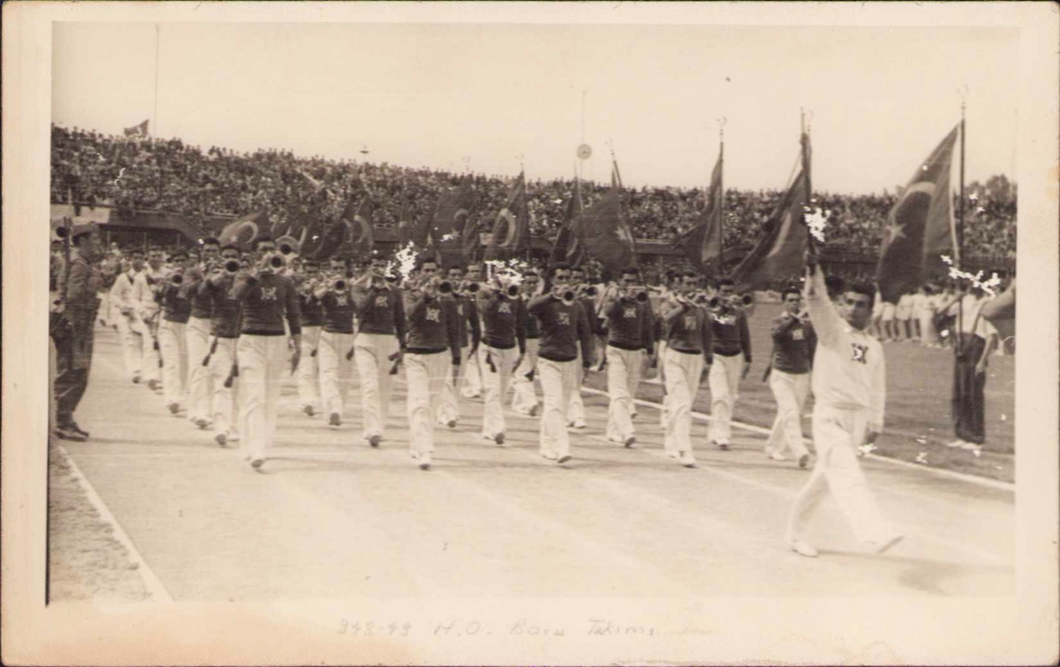 Harp Okulu Boru Takımı, 1948-1949 dönemi, tören alanında yürüyüş, bayrak detaylı, 14x9cm
