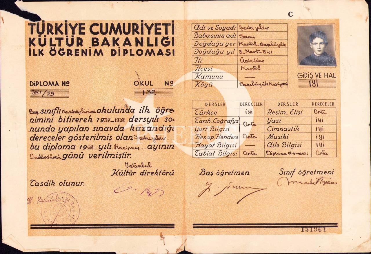 Fotoğraflı ilk öğrenim diploması, Kadıköy 1938, 22x33 cm, üst köşe yırtık haliyle