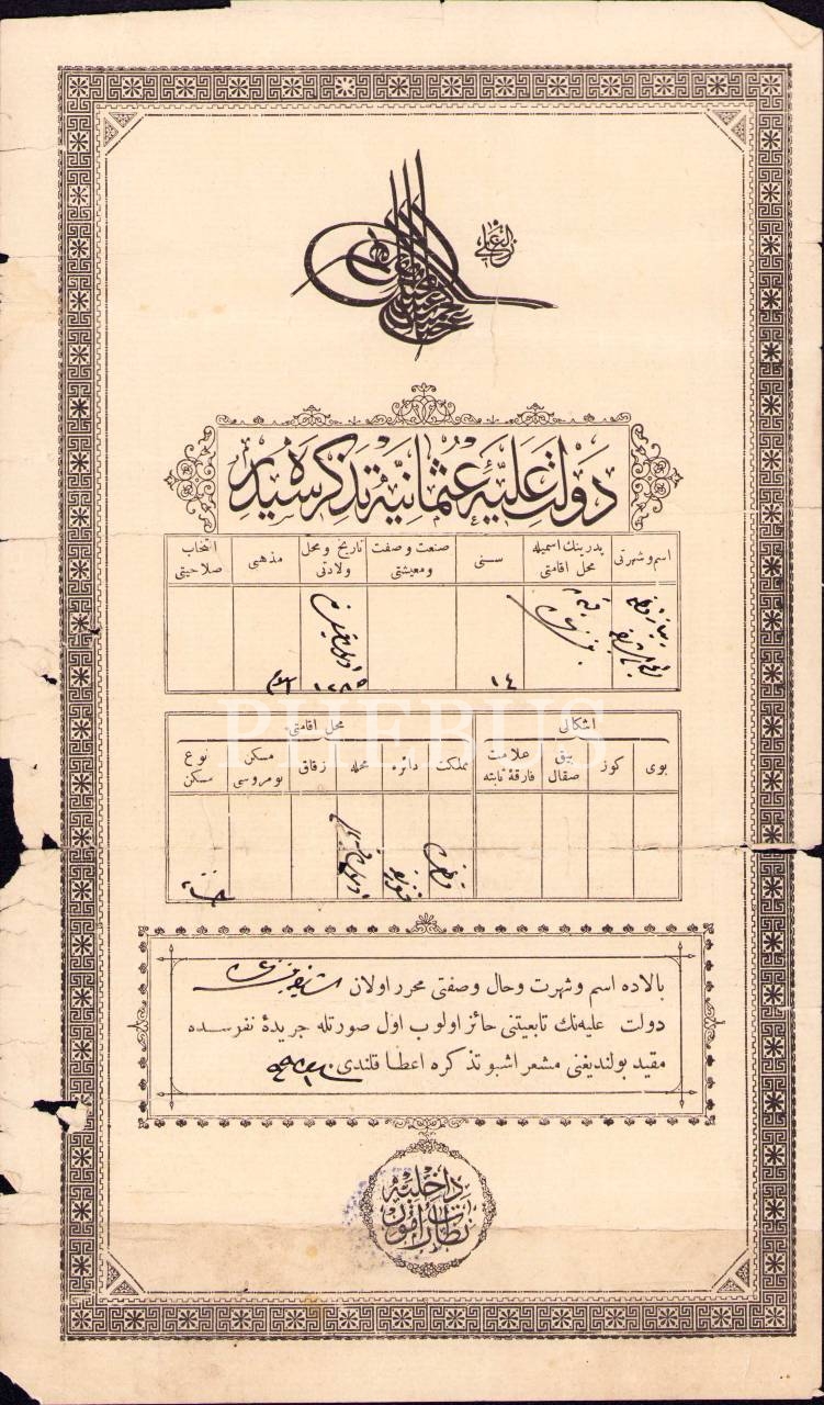 Osmanlıca 1299 tarihli nüfus tezkiresi, 17x29 cm, haliyle