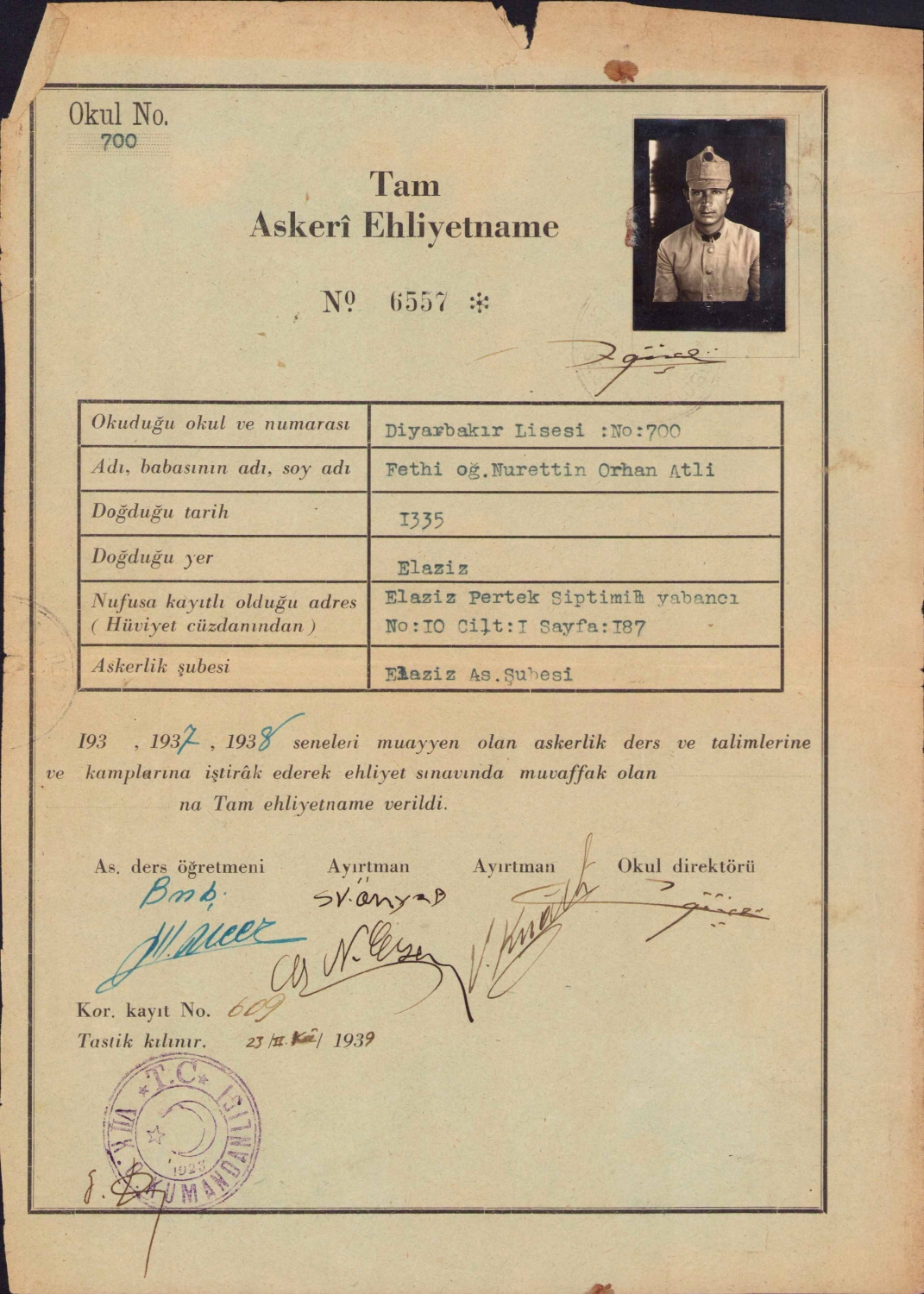 Tam Askeri Ehliyetname, Elaziz adresli, 1939 tarihli, mühürlü, fotoğraflı, 20x28cm