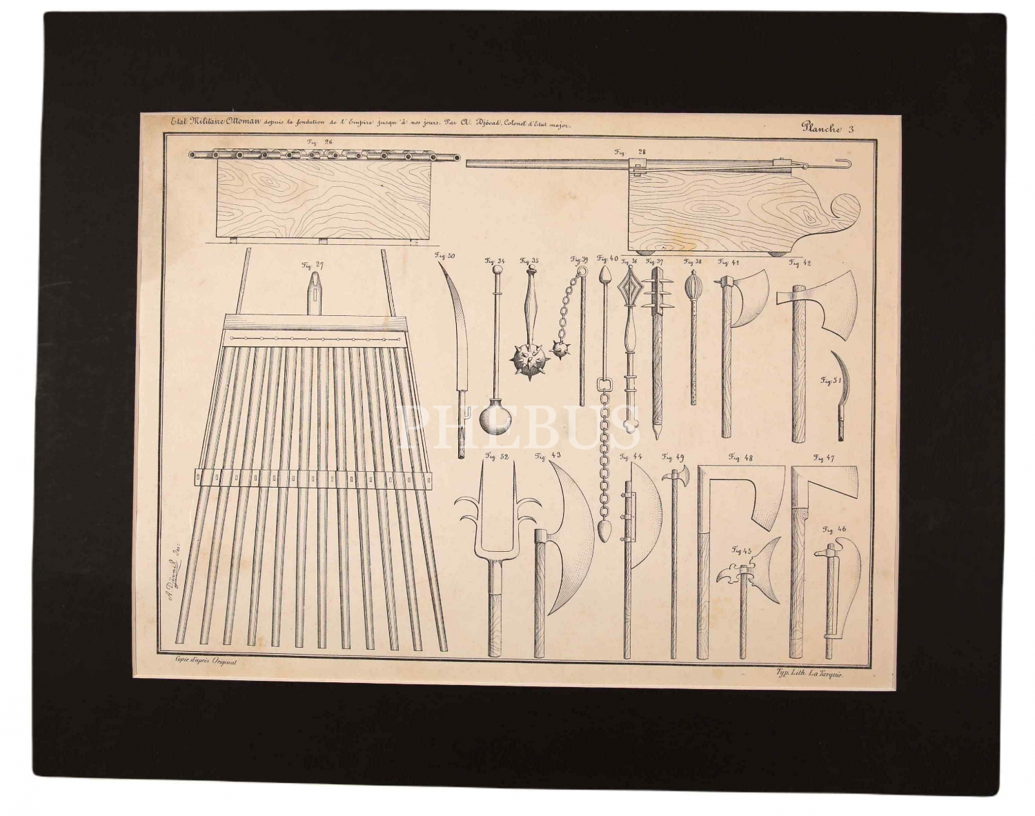 Osmanlı dönemi savaş aletlerini gösterir tablo, A. Djevad imzalı, 26x35 cm