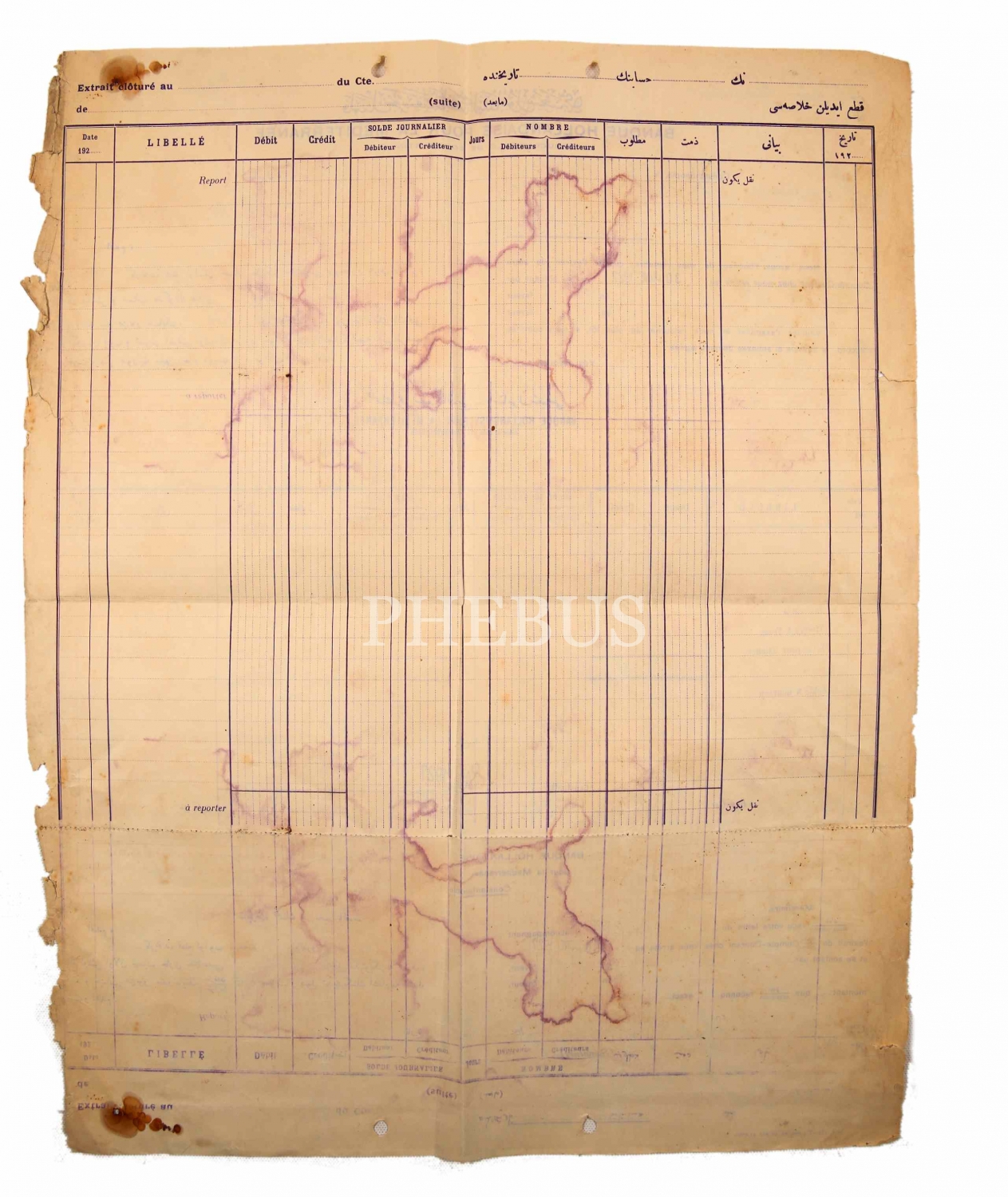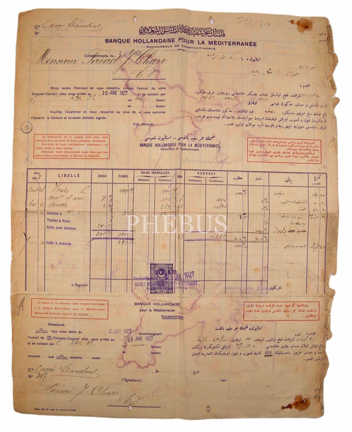 Osmanlıca-Fransızca Felemenk Bahr-i Sefid Bankası İstanbul Şubesi antetli hesap onay kağıdı, 1917, 32x41 cm, kenarları haliyle