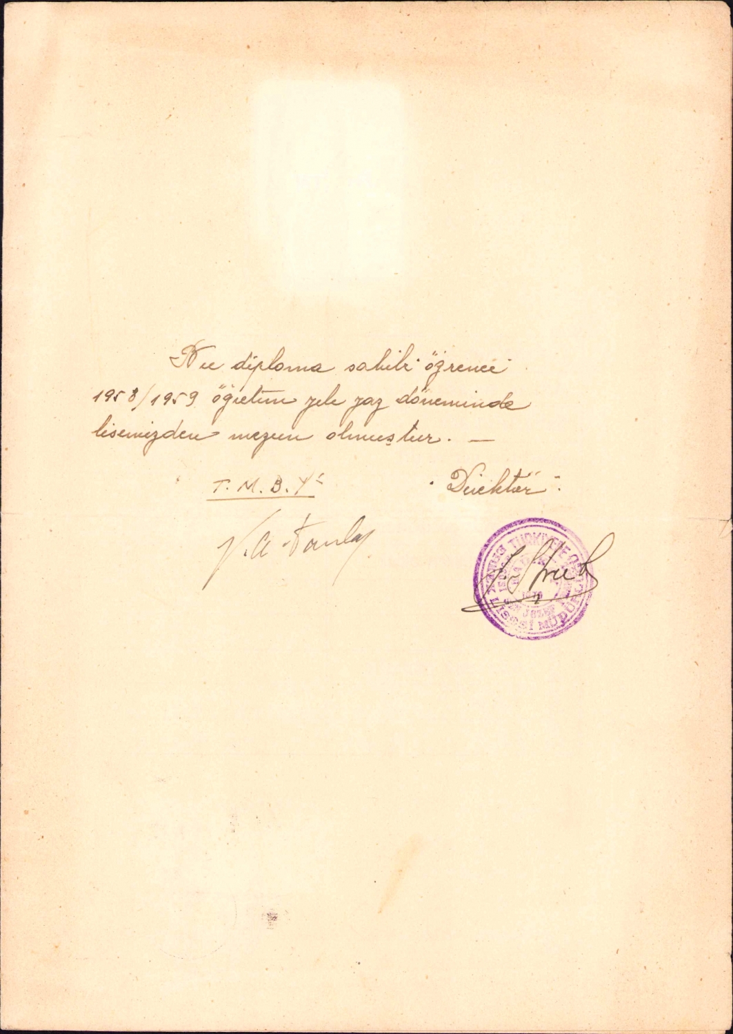 Türkiye Yabancı Okullara Mahsus Orta Okul Diploması, Saint-Joseph Fransız Lisesi, 1956 tarihli, fotoğraflı, pullu, mühürlü, 42x30cm