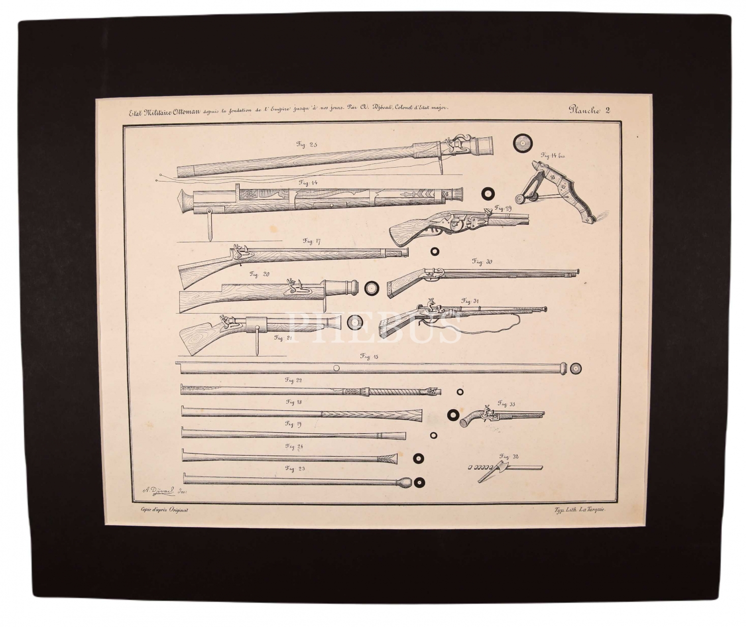 Osmanlı savaş aletleri tablosu, A. Djevad imzalı, 25x32 cm