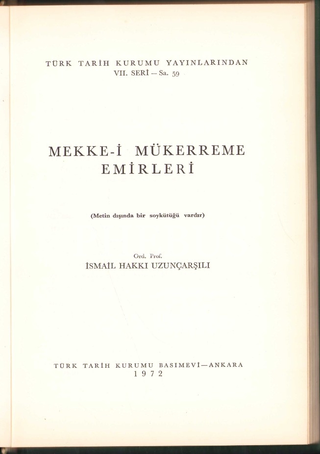 Mekke-i Mükerreme Emirleri, Ord. Prof. İsmail Hakkı Uzunçarşılı, Türk Tarih Kurumu Basımevi - Ankara 1972, 177 sayfa, 17x24 cm