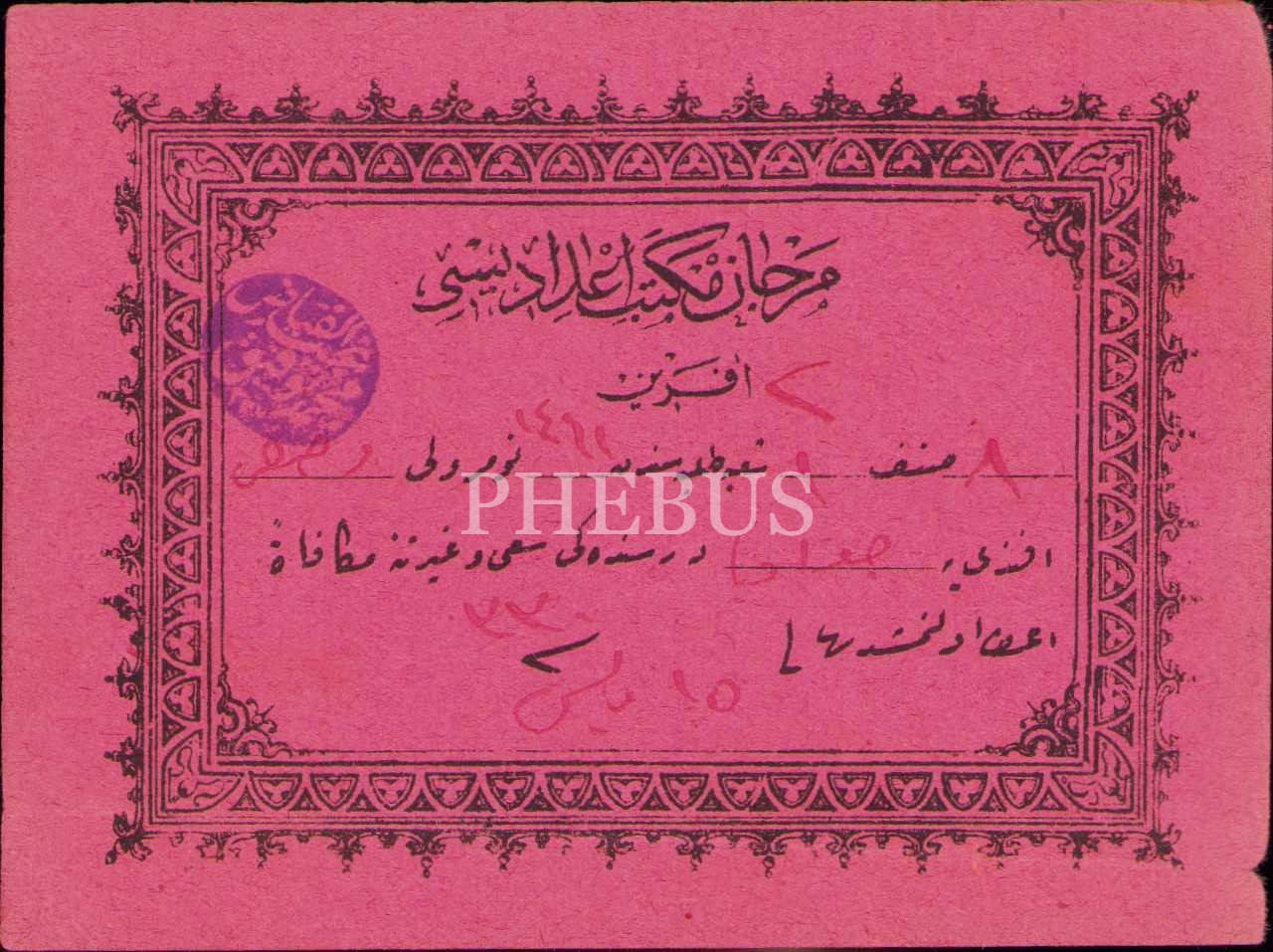 Osmanlıca Mercan Mekteb-i İdadisi aferin kağıdı, 1330 tarihli, 8x11 cm
