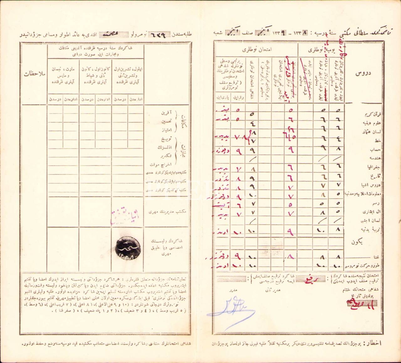 Osmanlıca etvâr ve mesâi cüzdanı [öğrenci karnesi], Kadıköy Sultanisi, 1338-39 eğitim yılı, 21x24 cm