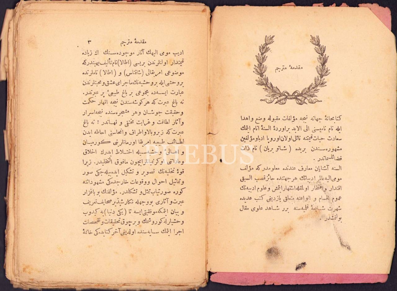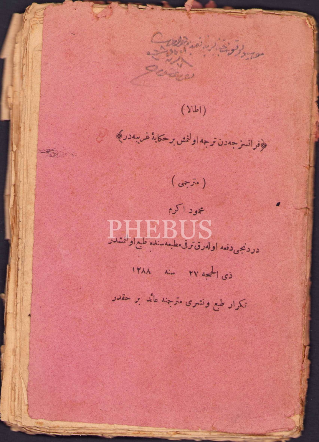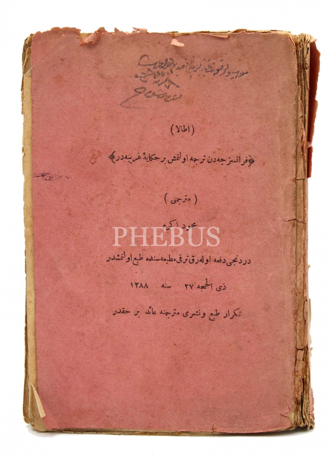 Osmanlıca Atala, "Fransızcadan tercüme olunmuş bir hikâye-i garîbedir", çev. Mahmud Ekrem, Terakki Matbaası, 1288, 138 s., 13x19 cm, sayfa kenarları haliyle