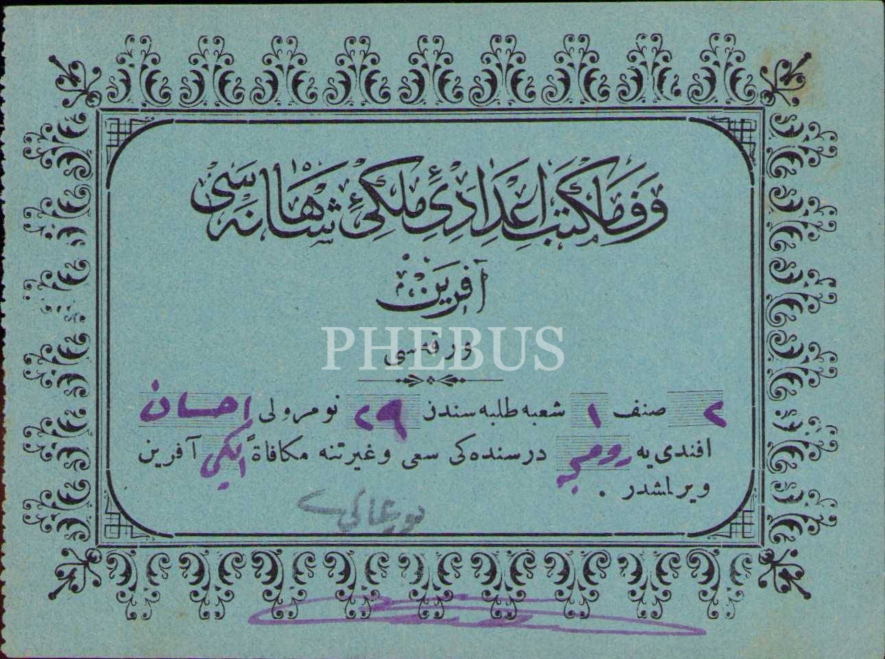 Vefa Mekteb-i İdadisi aferin kağıdı, 8x11 cm