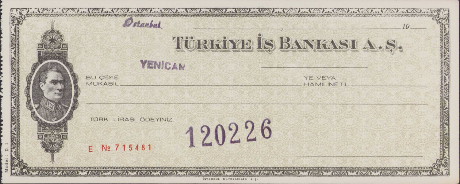 Türkiye İş Bankası çeki, Atatürk görselli, İstanbul Yenicami adresli