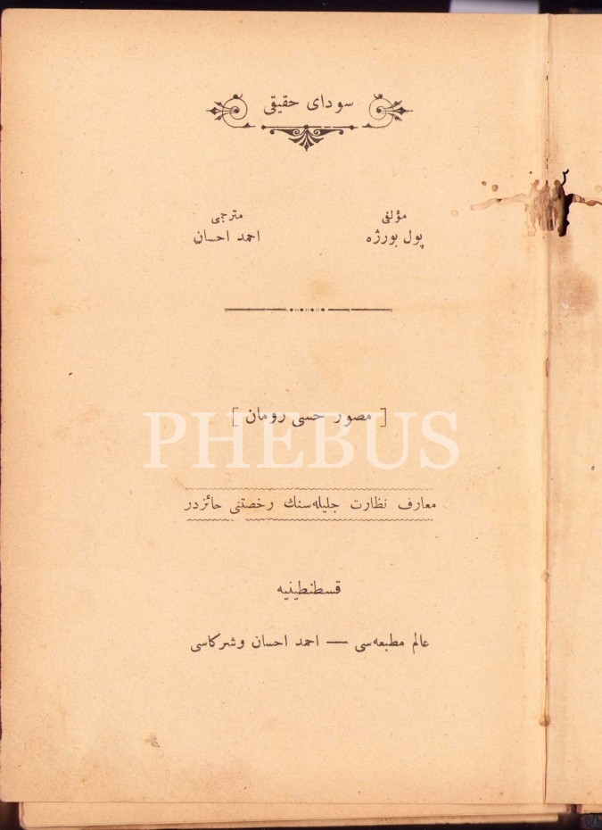 Osmanlıca 2 kitap tek ciltte: Sevdâ-yı Hakîkî, Paul Bourget, çev. Ahmed İhsan, Alim Matbaası, Kostantiniyye, 194 s.; Son Aşk, Karabet Matbaası, İstanbul 1305, 398 s., 12x18 cm, sırtı haliyle