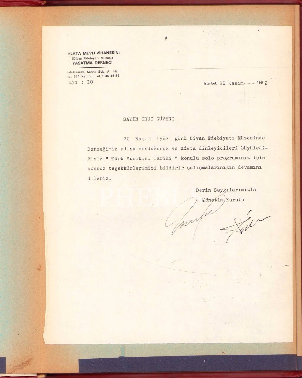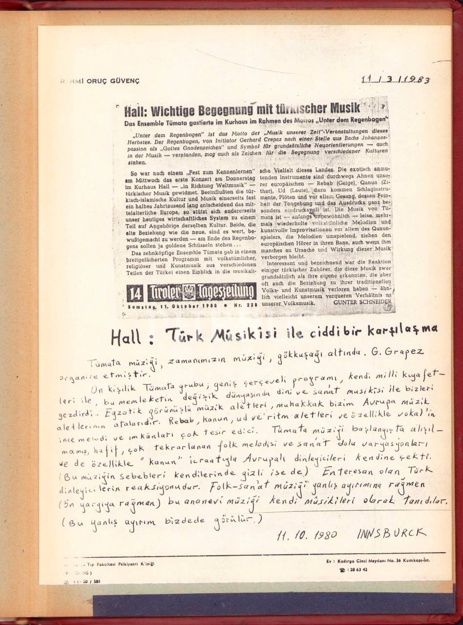 Müzisyen Oruç Güvenç'in terekesinden çeşitli evrak, fotoğraf ve gazete kupürleri, albüm halinde, 23x32 cm