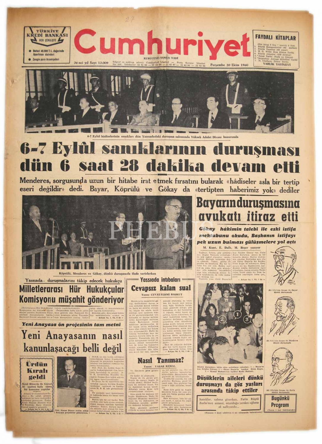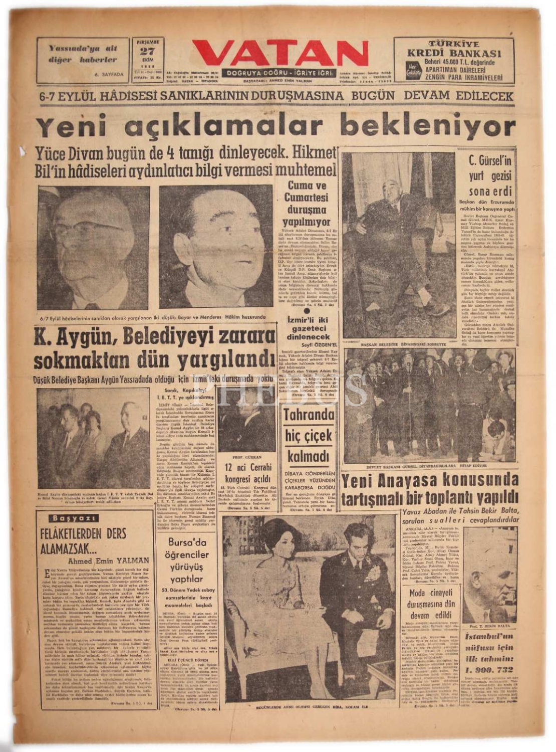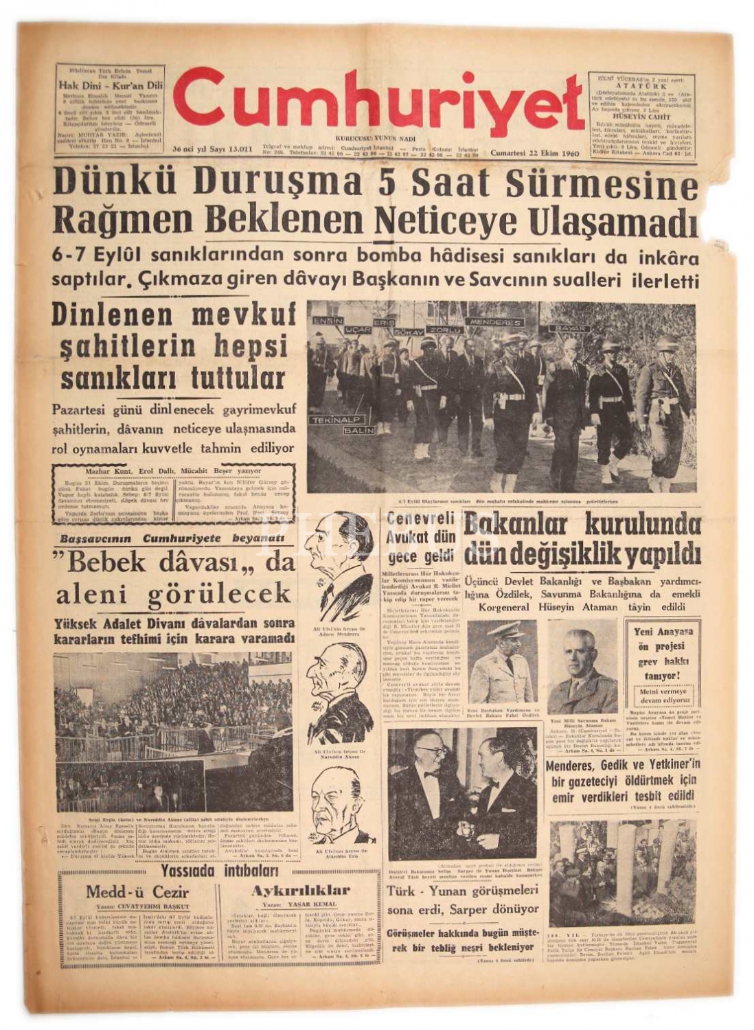 6-7 Eylül davasına dair haberlerin yer aldığı 1960 tarihli 8 adet gazete, 42x48 cm