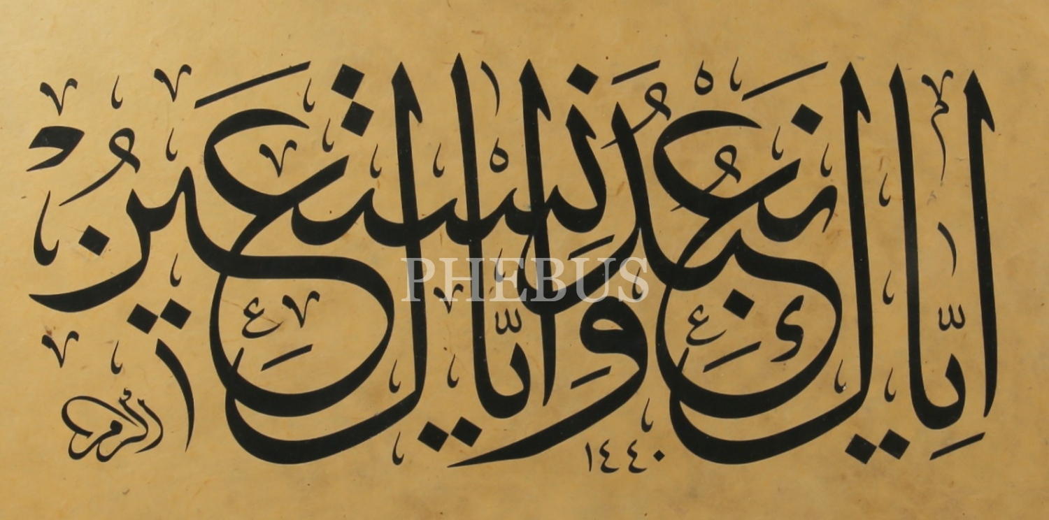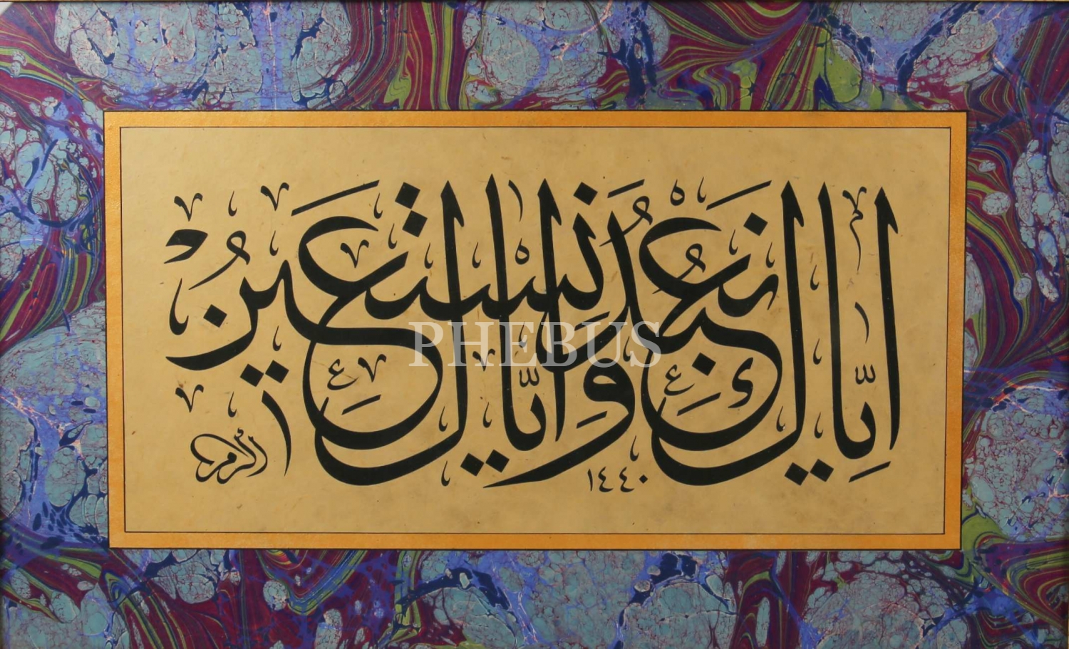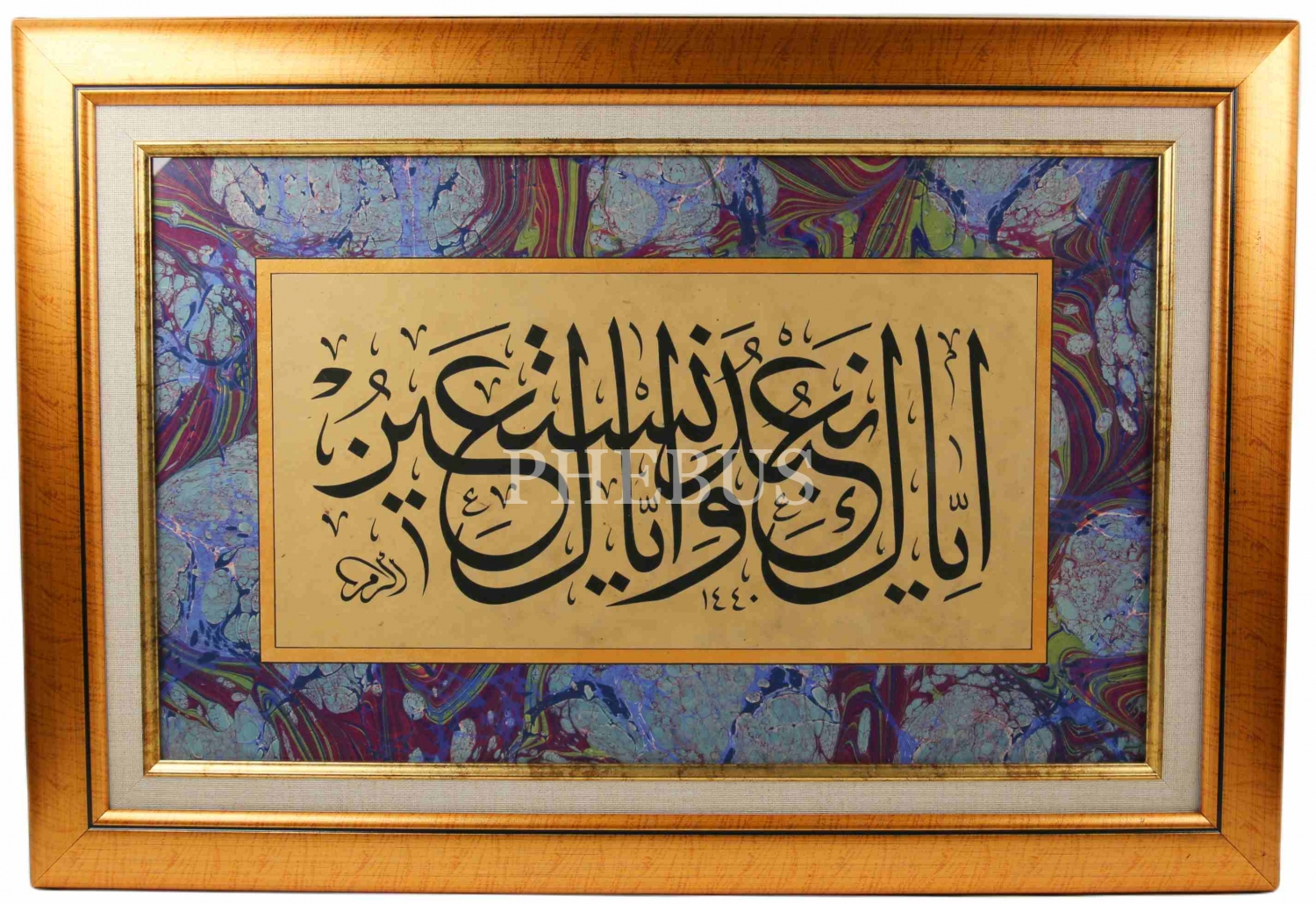 Celî Sülüs Levha "İyyâke na'budu ve iyyâke nestaîn [Yalnız sana ibadet eder, yalnız senden yardım dileriz]", Ekrem ketebeli, ebrulu ve çerçeveli, 54x33 cm