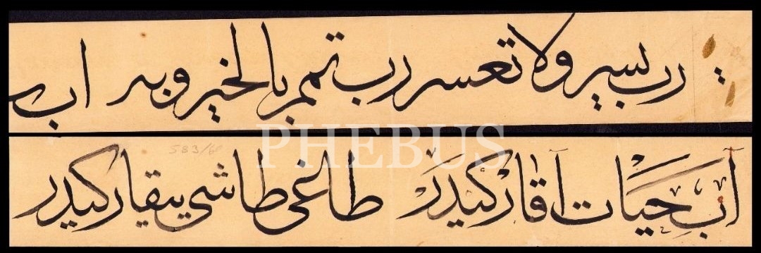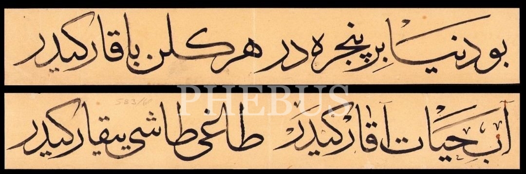 Sülüs Rabbi Yessir ve Osmanlıca Beyit "Bu dünya bir penceredir, her gelen bakar gider", Hurufât Meşki, 2 adet, 34x5 cm