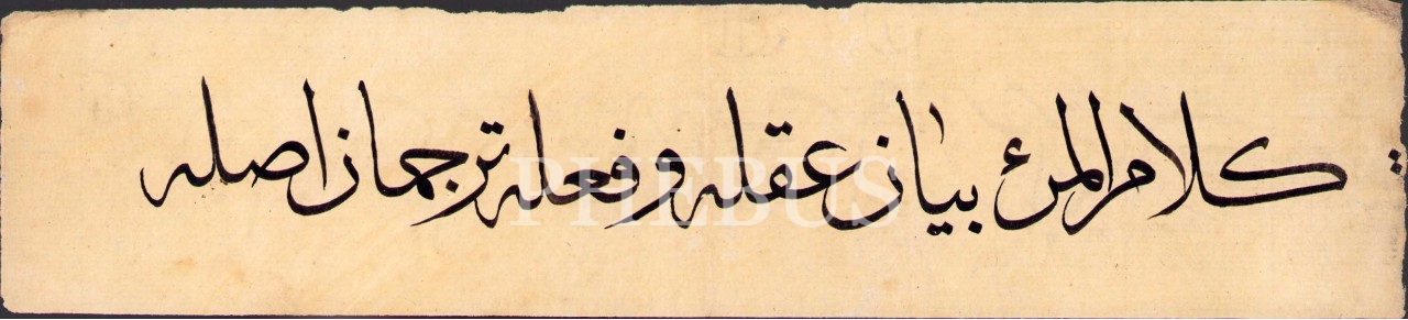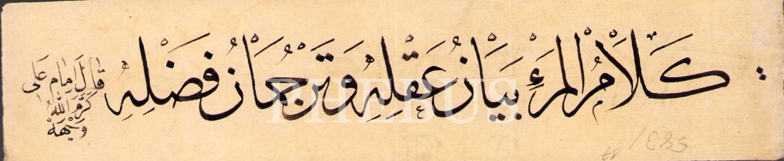 Sülüs Yazı, "Kelâmu'l-mer'i beyânu aklihi ve fi'luhu tercümân-ı aslihi [Kişinin sözleri aklının; yapıp ettikleri de aslının göstergesidir]", Hz. Ali'nin Bir Sözü, 25x6 cm