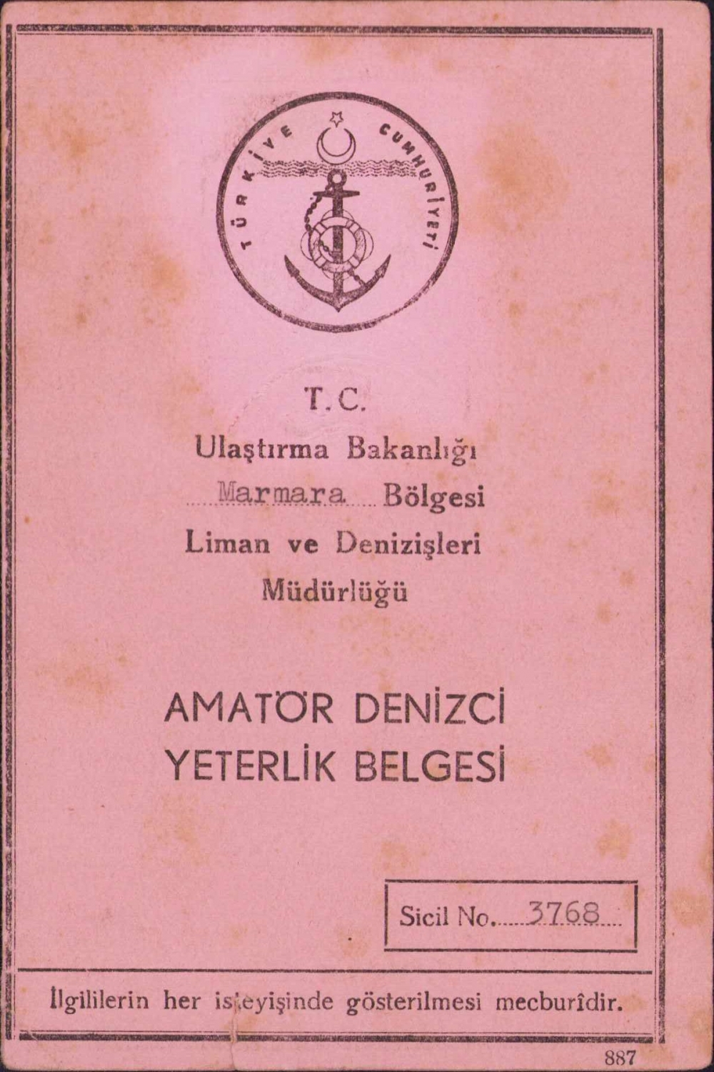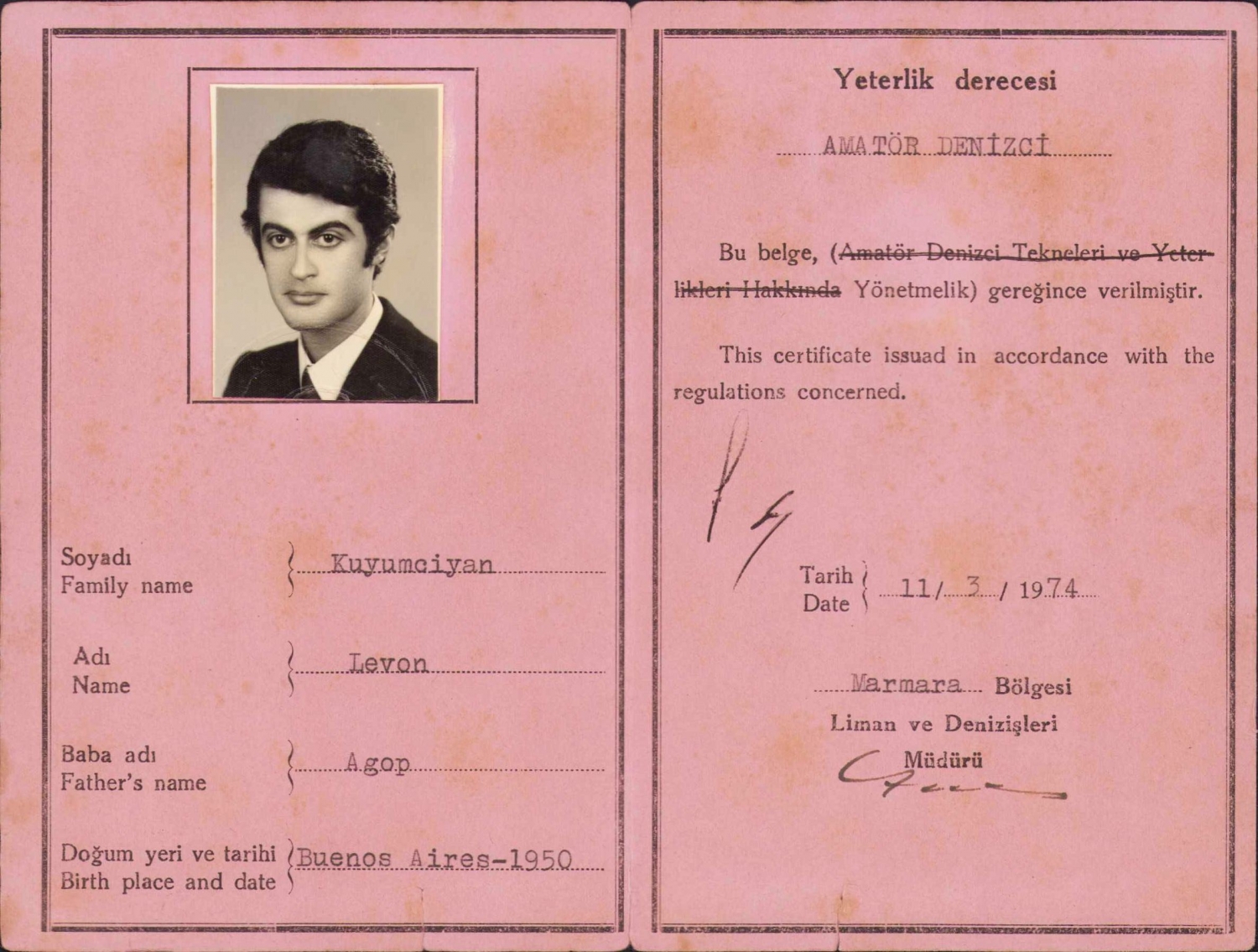 Ulaştırma Bakanlığı Amatör Denizcilik Yeterlilik Belgesi, Levon Kuyumciyan adına düzenlenmiş, 1974 tarihli, 10x15cm