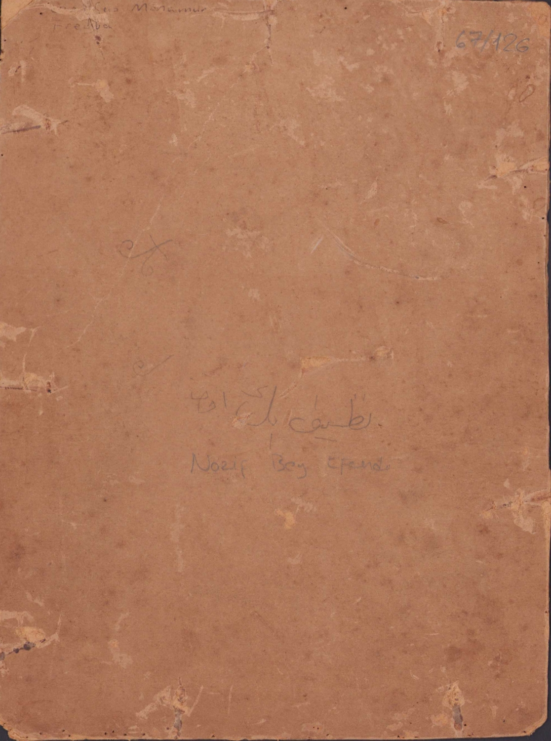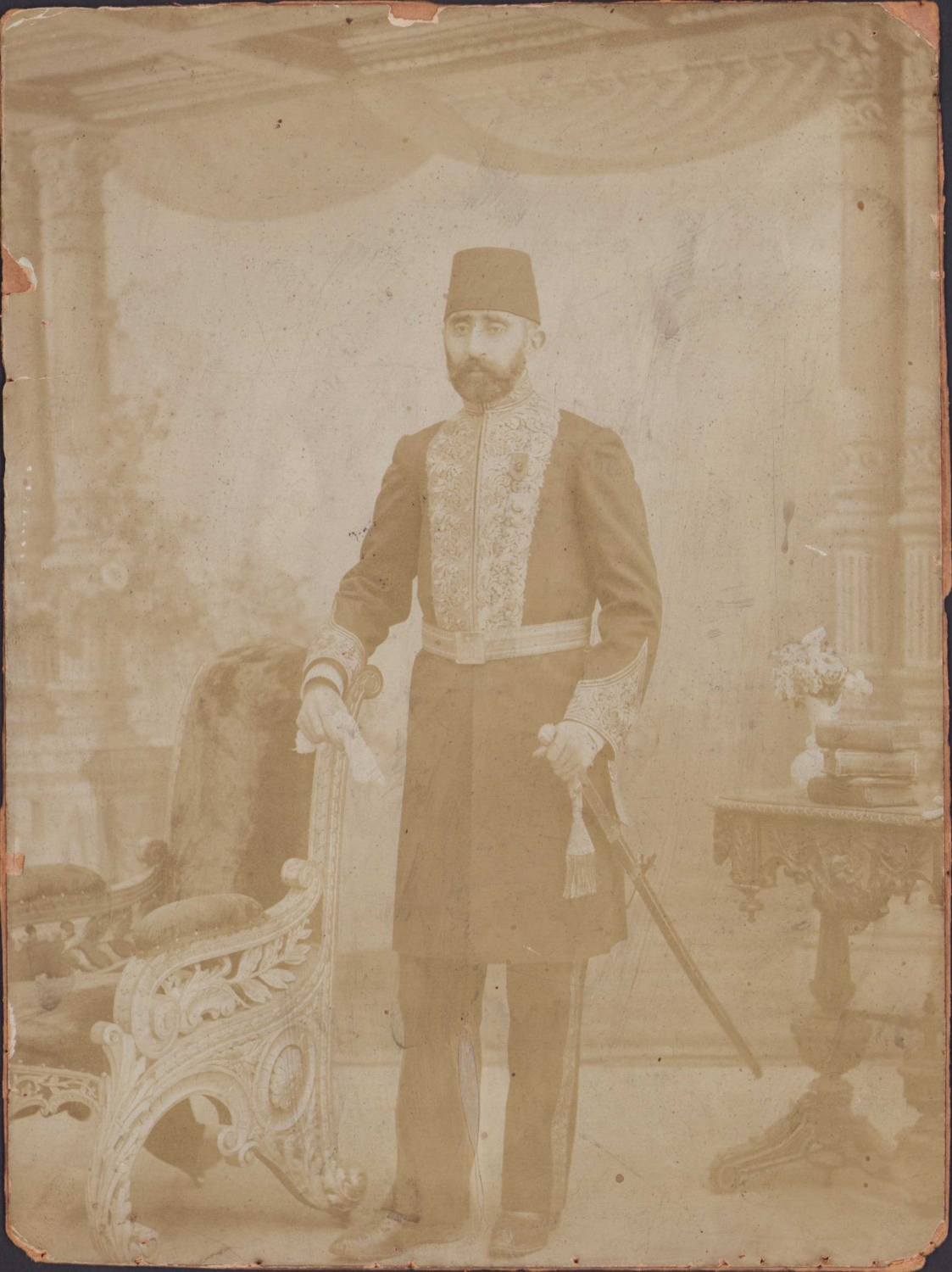 Osmanlı Paşası Nazif Efendi'nin portresi, fes, püsküllü kılıç ve kitap detaylı, kabin fotoğrafı, arkası Osmanlıca yazılı, 17x22cm