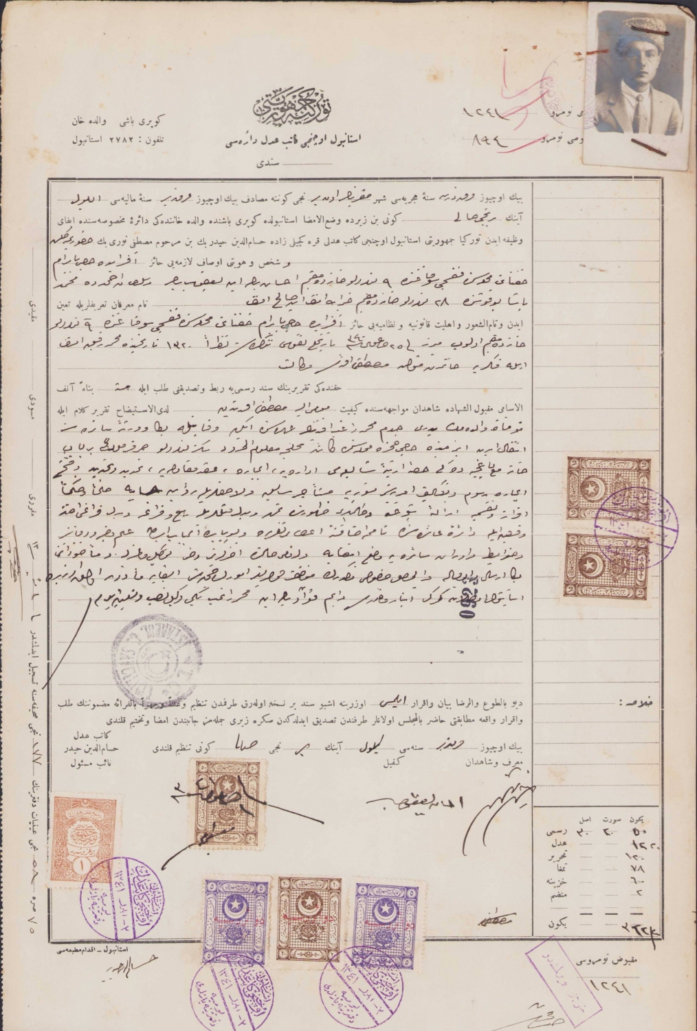 Osmanlı İstanbul Üçüncü Katip Adli Dairesi senedi,1341 tarihli, bol pullu damgalı, 25x38cm
