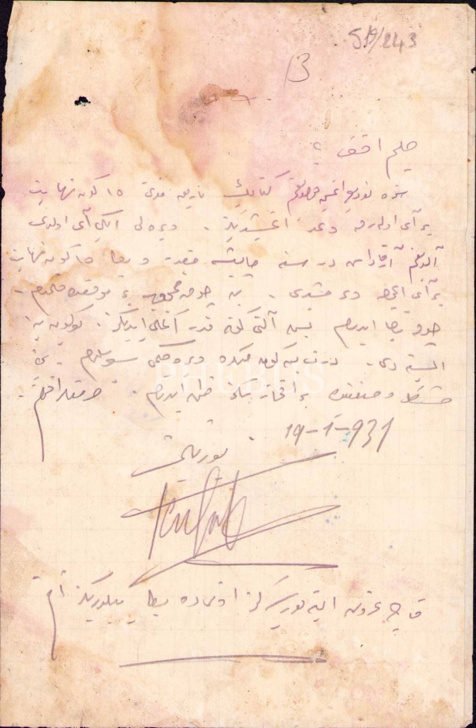 Hattat Halim Efendi'ye Yazılmış Mektup, 19.01.1931 tarihli, 12x19 cm
