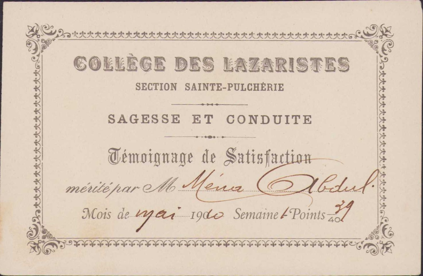 Lazarites Koleji'nden verilmiş Fransızca yazılı aferin, 1910 tarihli, 12x8cm