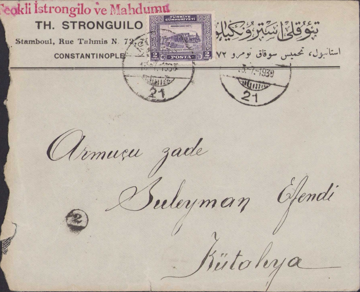 Teokli İstrongilo ve Mahdumu Th. Stranguilo antetli, Constantinople, Osmanlıca yazılı, 1930 tarihli, postadan geçmiş, Kütahya'da mukim Armutçuzade Süleyman Efendi'ye gönderilmiş