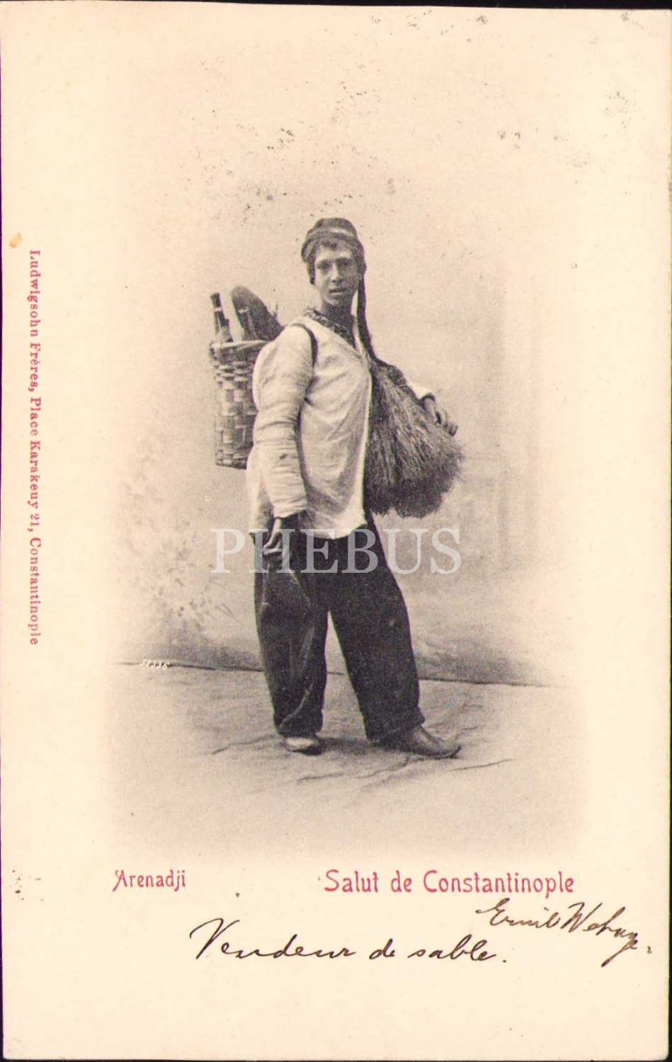 Osmanlı Dönemi Meslek Kartpostalı, "Arenadji", Süpürgeci, Editör: Jacques Ludwigsohn, postadan geçmiş, arkası İtalyanca