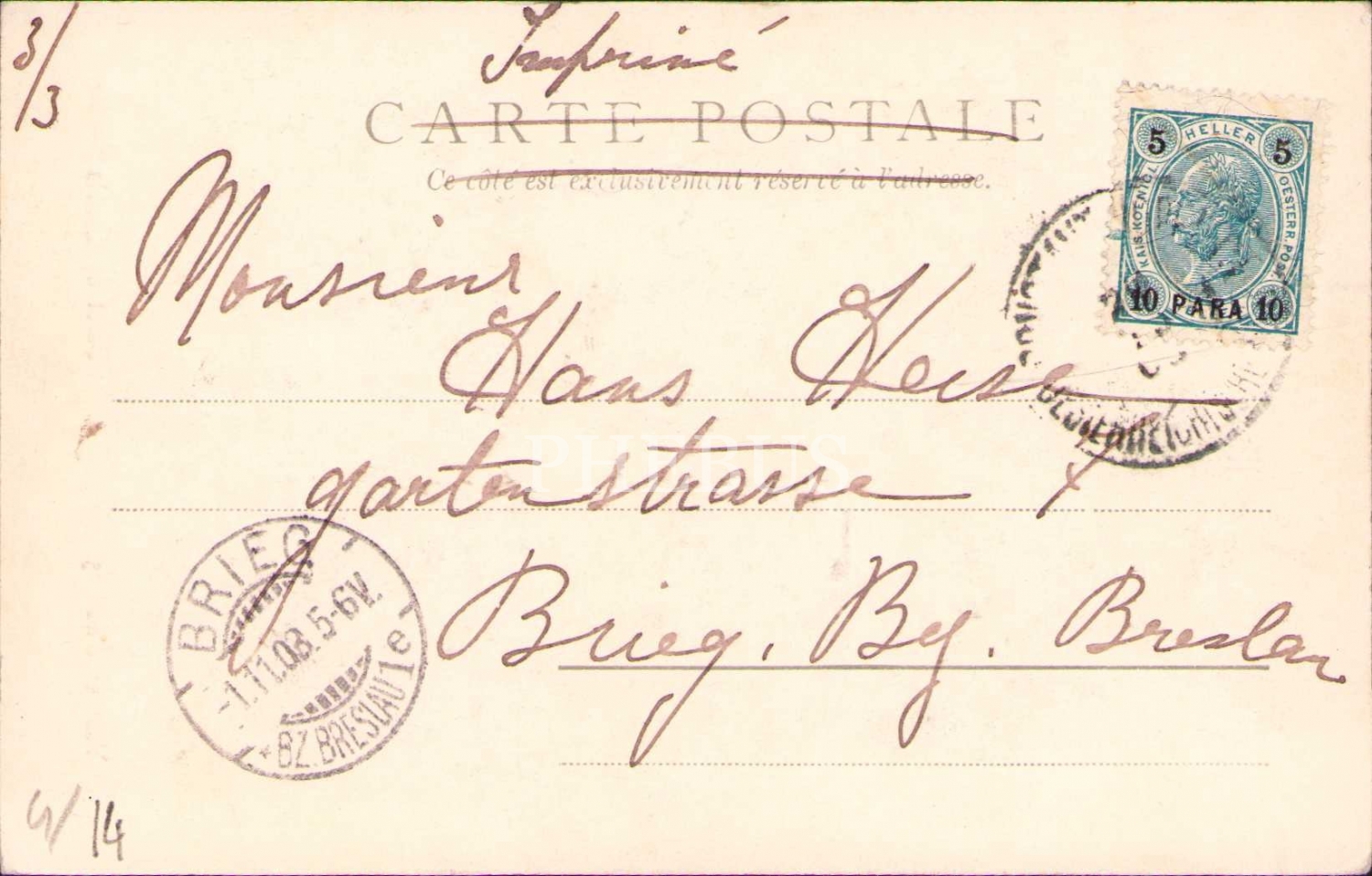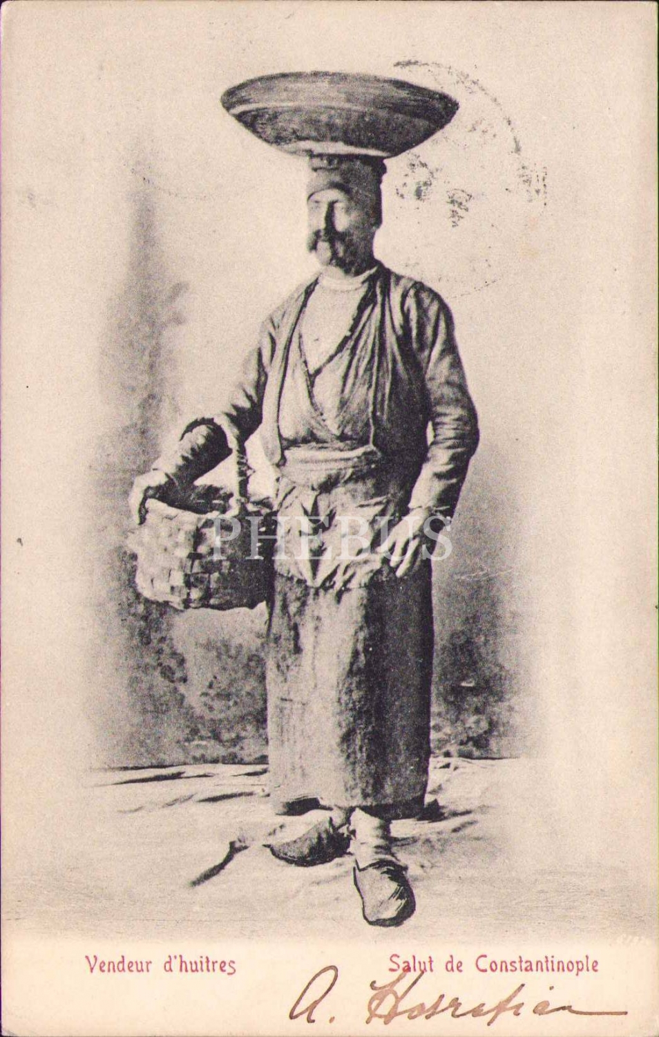 Osmanlı Dönemi Meslek Kartpostalı, "Vendeur d'huires", İstiridye Satıcısı, Salut de Constantinople, arkası ithaflı, postadan geçmiş