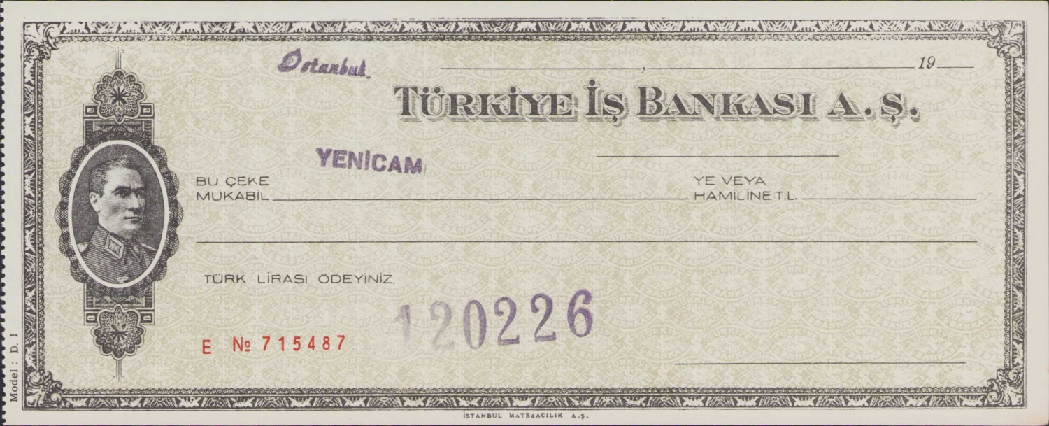 Türkiye İş Bankası AŞ, İstanbul Yenicami Şubesi, Atatürk görselli, çek yaprağı, 22x9cm