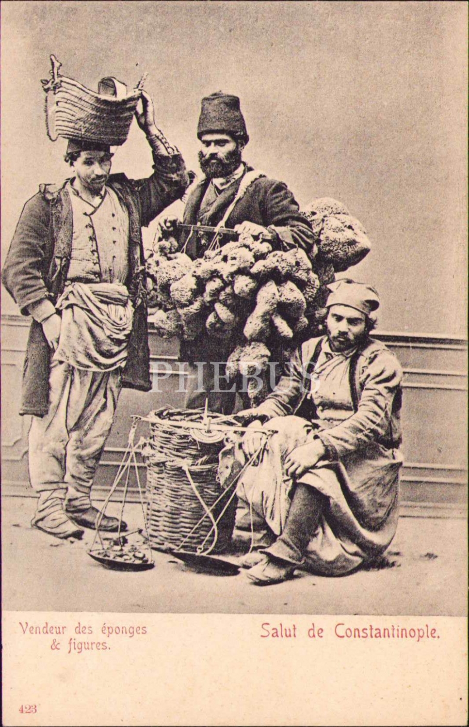 Osmanlı Dönemi Kartpostal, "Vendeur des eponges", Sünger satıcısı, Salut de Constantinople