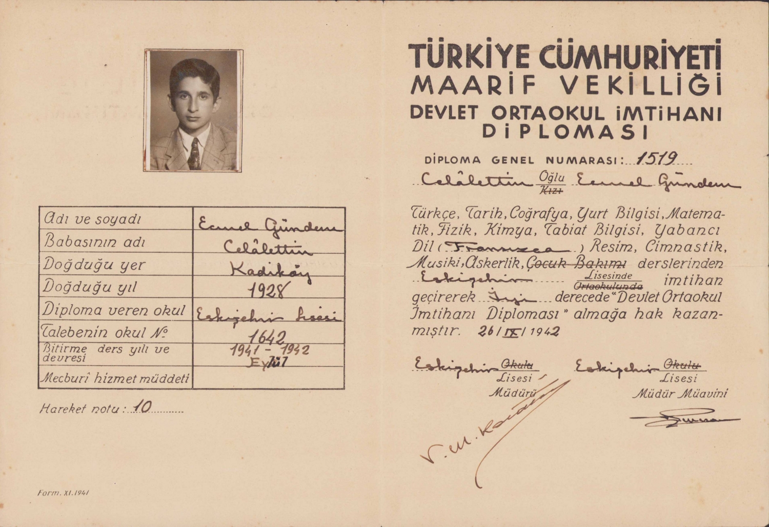 Türkiye Cümhuriyeti Maarif Vekilliği Devlet Ortaokul İmtihan Diploması, Eskişehir Lisesi, 1942 tarihli, fotoğraflı, soğuk damgalı, 33x23cm