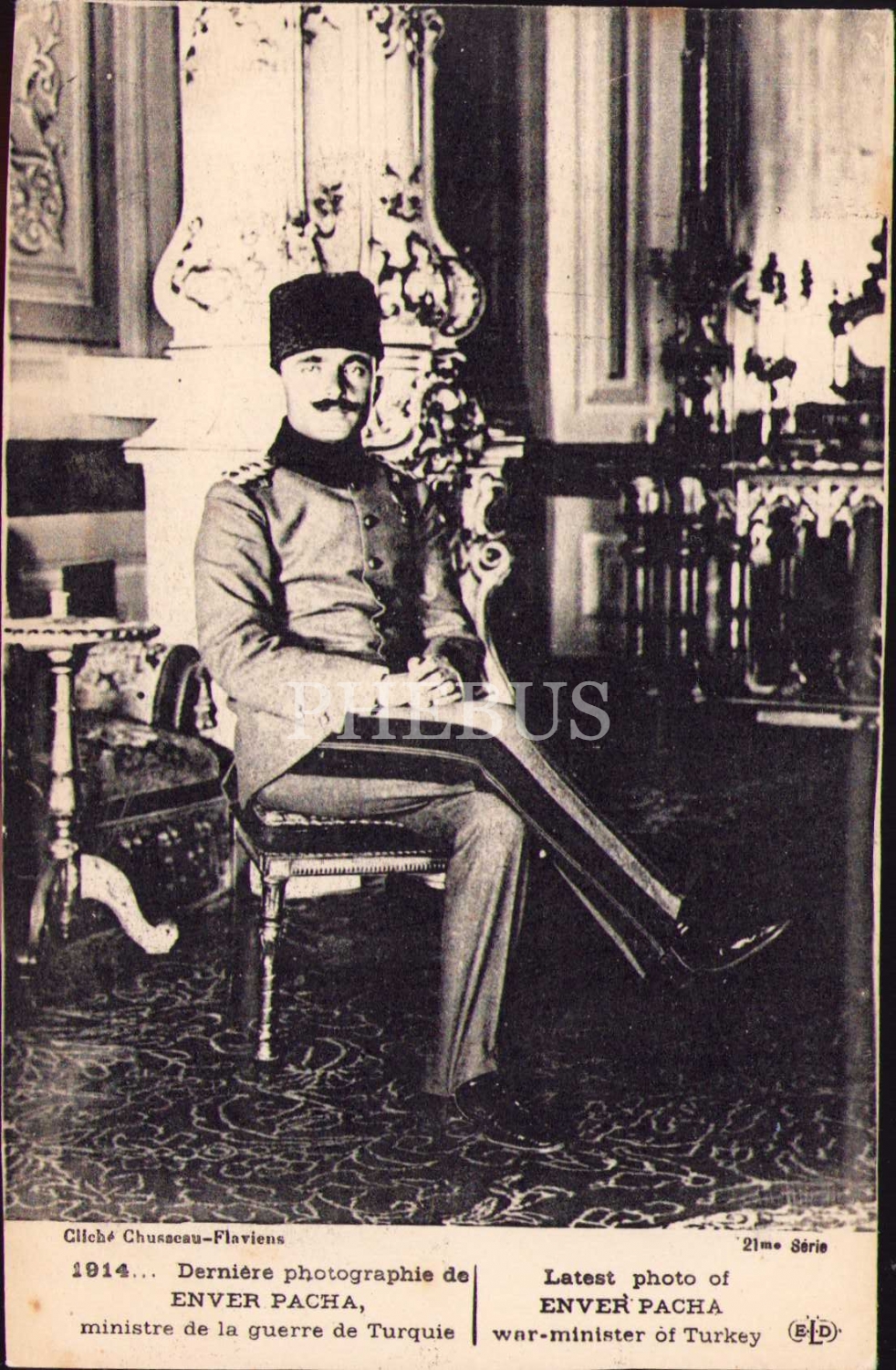 Osmanlı Dönemi Kartpostal, İttihad ve Terakki Liderlerinden Enver Paşa, Fransızca ve İngilizce iki dilde, Paris Baskı, E Le Deley