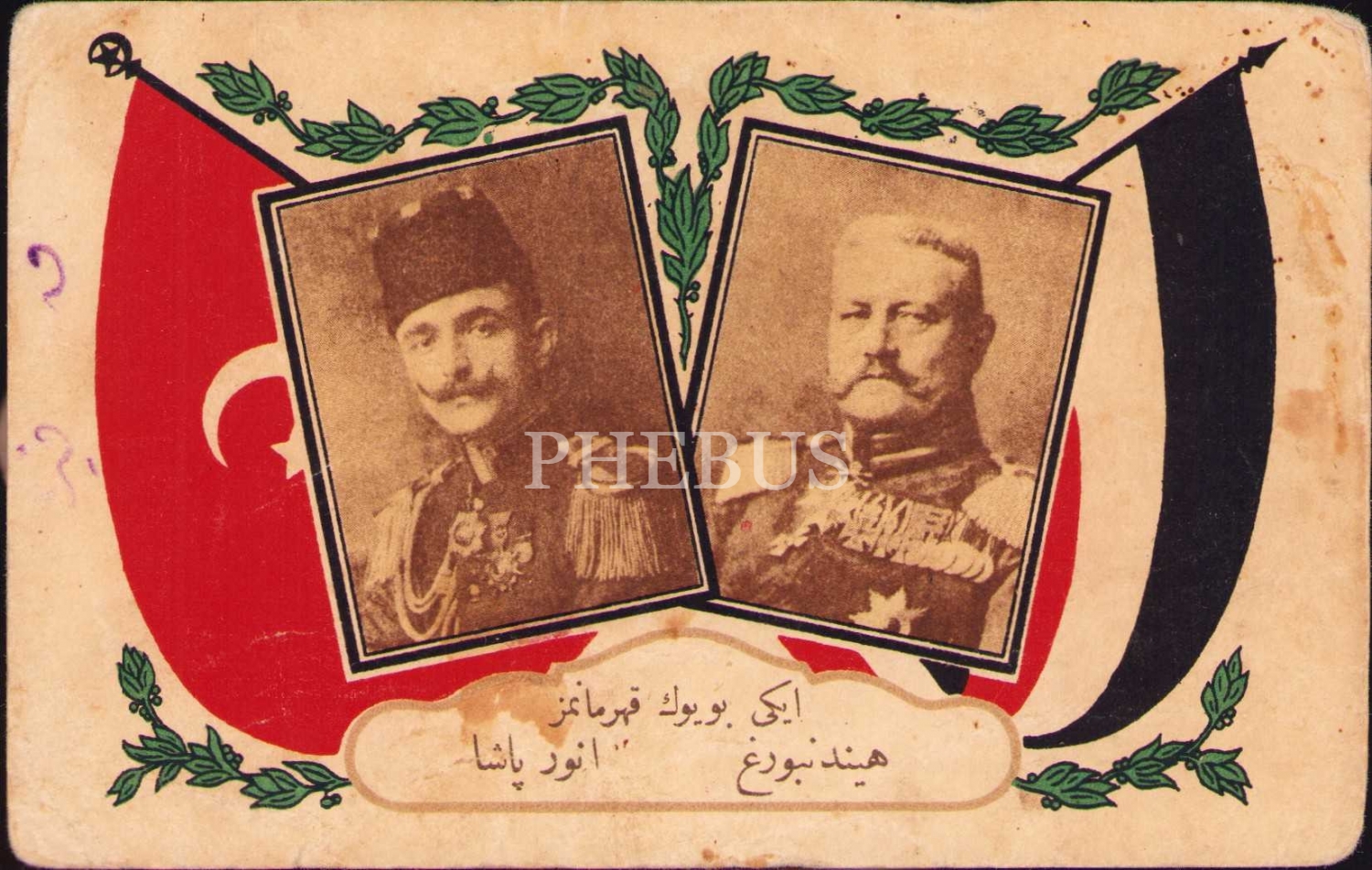 Osmanlı Dönemi Kartpostal, Osmanlıca "İki Büyük Kahramanımız" yazılı, Enver Paşa ve Hindenburg, Alman ve Türk bayraklı