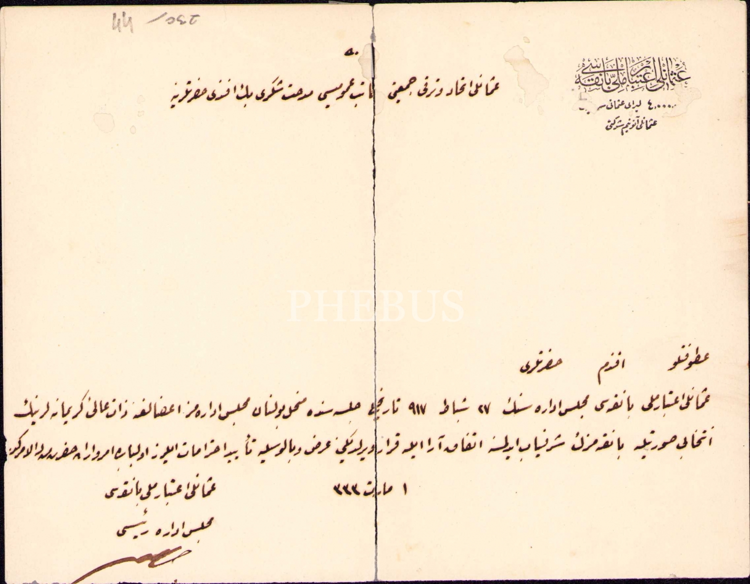 Osmanlı İttihad-ı Milli Bankası antetli İttihat Terakki Genel Sekreteri Midhat Şükrü Bleda'ya bankanın idare azalığına seçildiğini bildiren Câvid Bey imzalı belge, 4 Mart 1333 tarihli, Osmanlıca