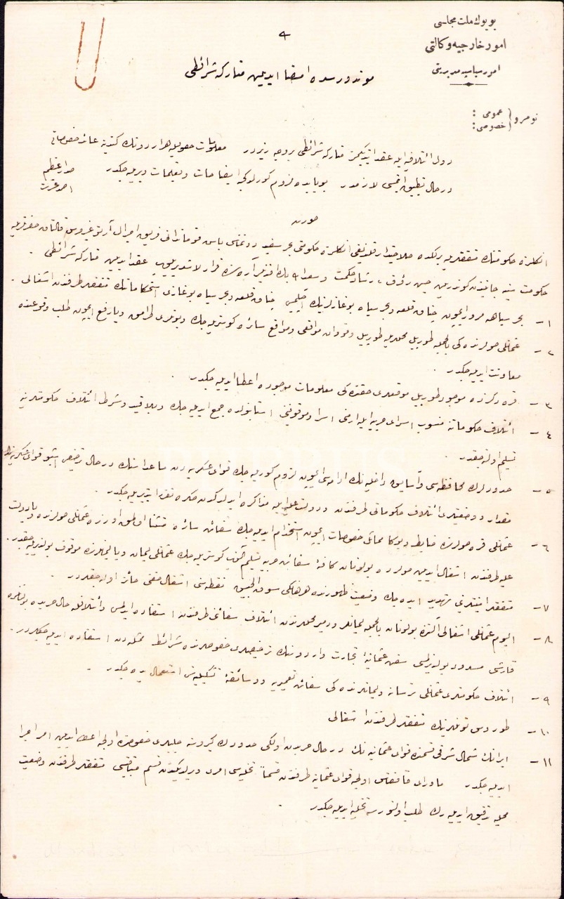 Metinde el yazısıyla Mondros Antlaşması'nın maddeleri yer almaktadır.